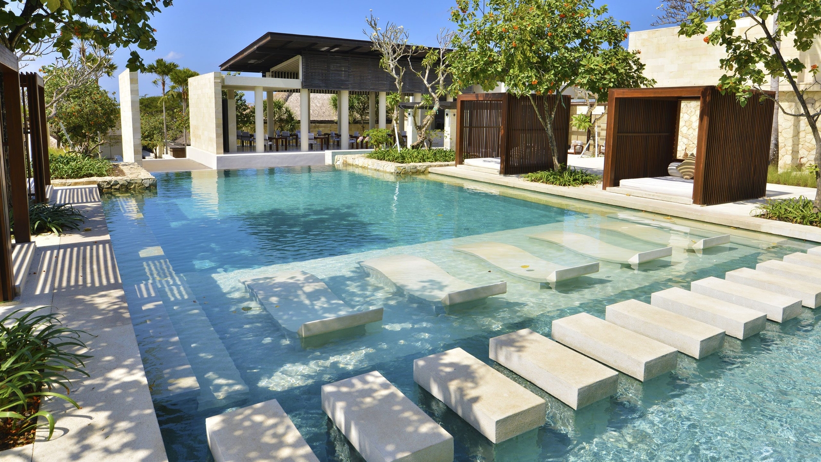Just five minutes’ walk from the beach and a 15-minute drive from the international airport, The Bale is a well-positioned modern tropical retreat. Its collection of very spacious pavilions are decorated in a sparse, contemporary style with private pools with the added bonus of enjoying its beach club on Geger Beach.