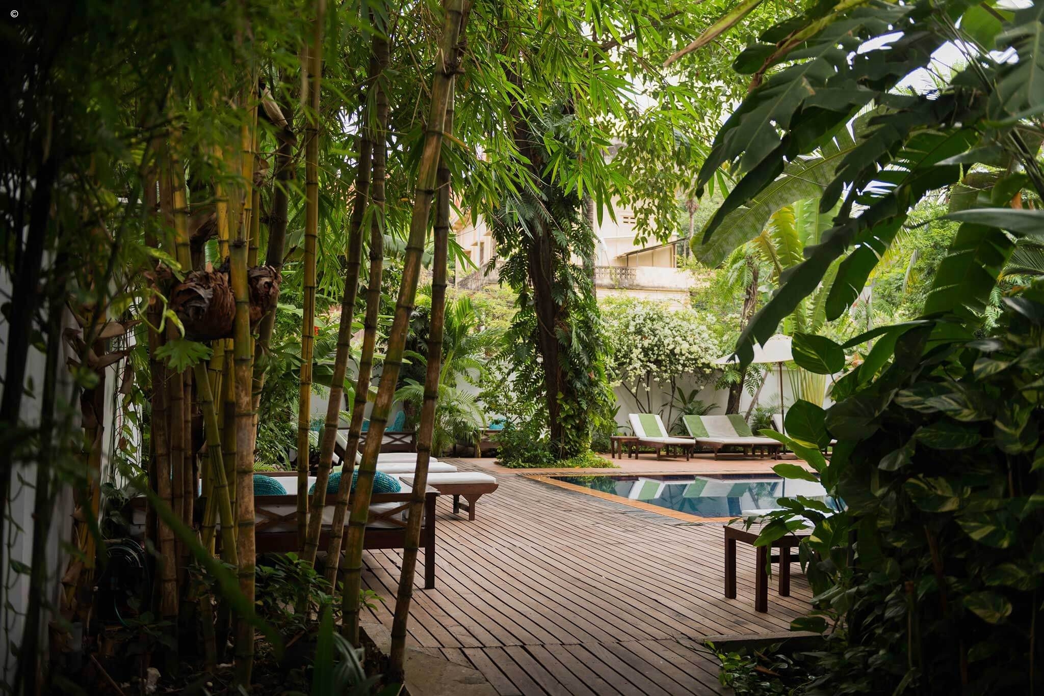 48 rooms, split evenly between a traditional khmer villa and a contemporary building, sit around a shady pool and fragrant green garden.