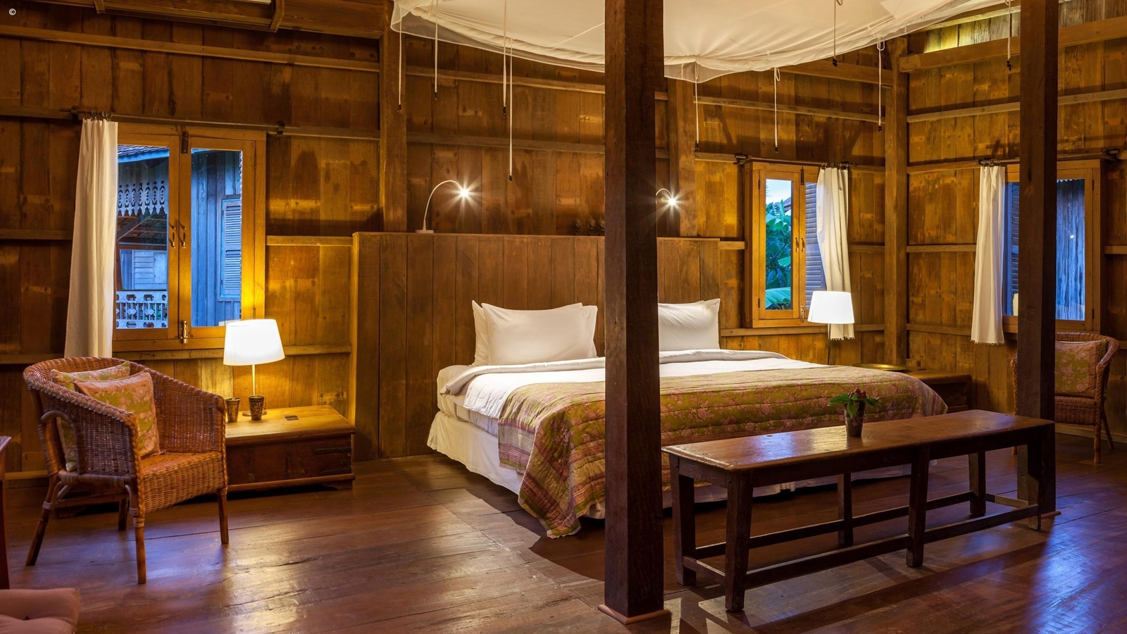 The eleven stilted wooden houses were purchased from nearby villages, dismantled, transported and beautifully restored, now providing tremendously comfortable lodgings with their individual character intact.