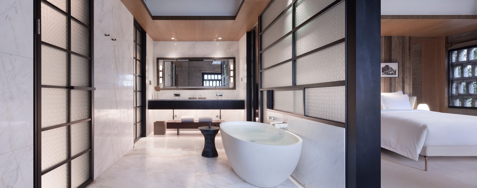 In keeping with the natural world around it, the main guestroom building uses a combination of local stone and bamboo. Meanwhile the 117 rooms and suites feature large open spaces with simple colour palettes and bathrooms boasting rain showers and twin bathtubs, perfect for achieving true relaxation.