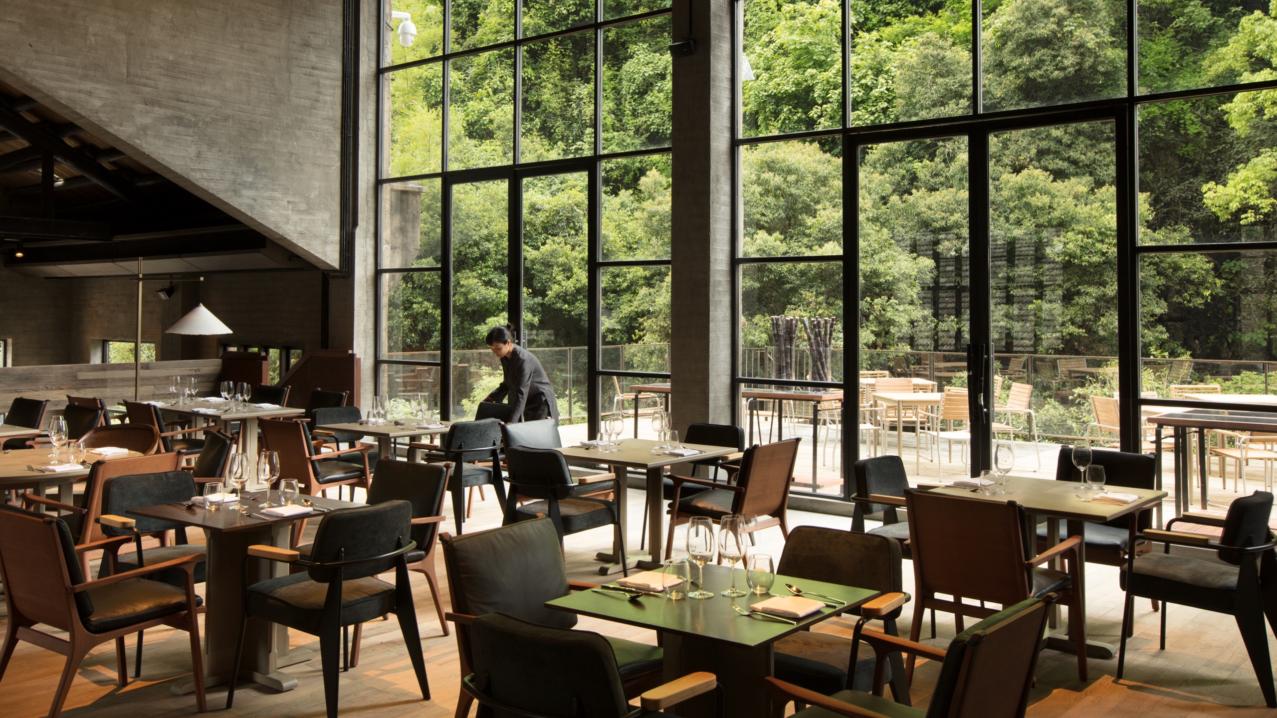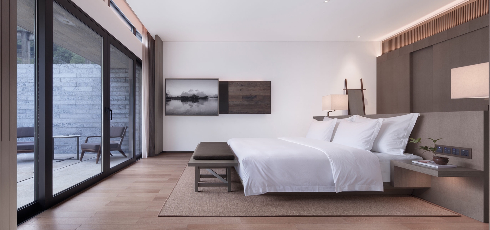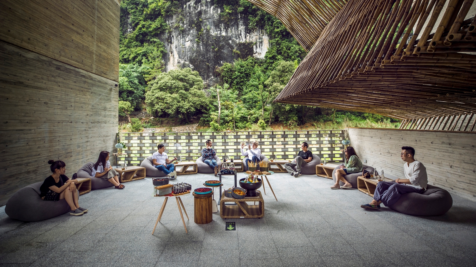 The hotel is an architectural masterpiece; a modern retro resort that uses a stylish simplicity to instil a sense of tranquillity indoors, perfectly matching the picturesque setting of greenery and dramatic karst mountains that surround you.
