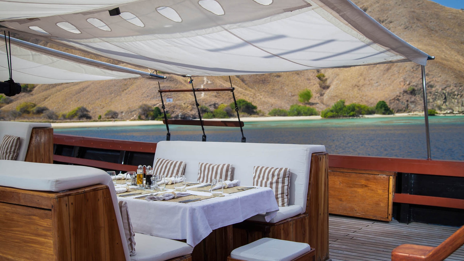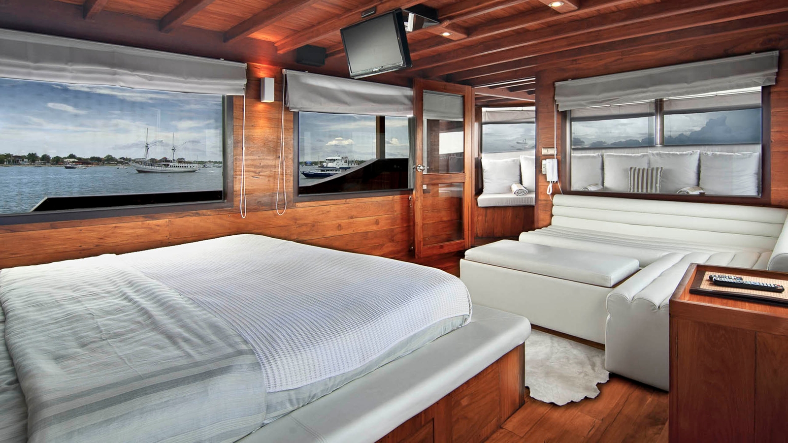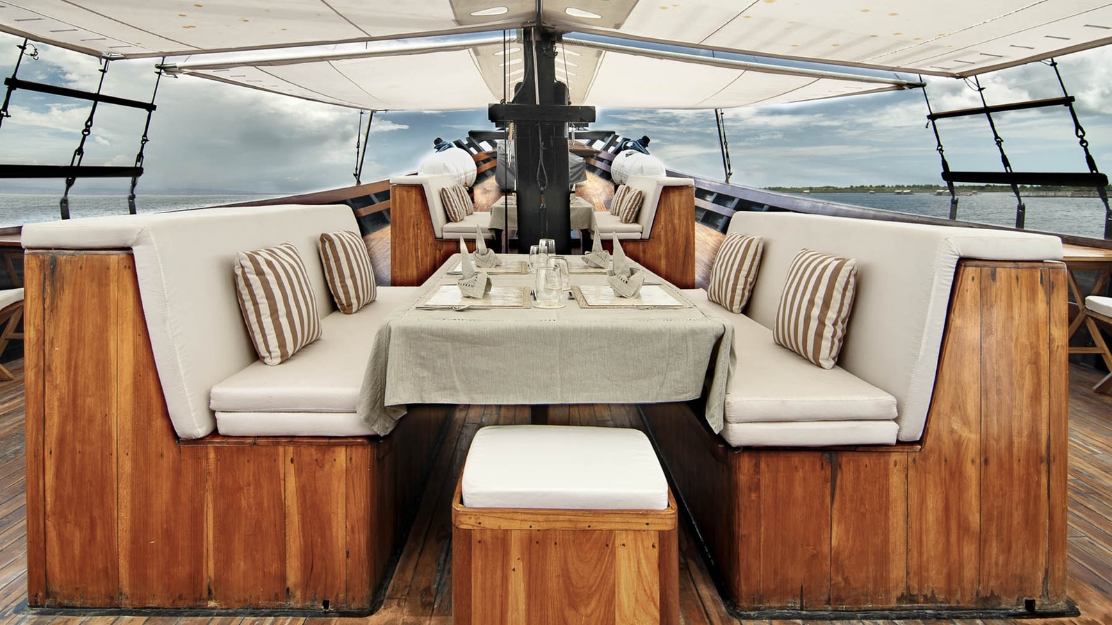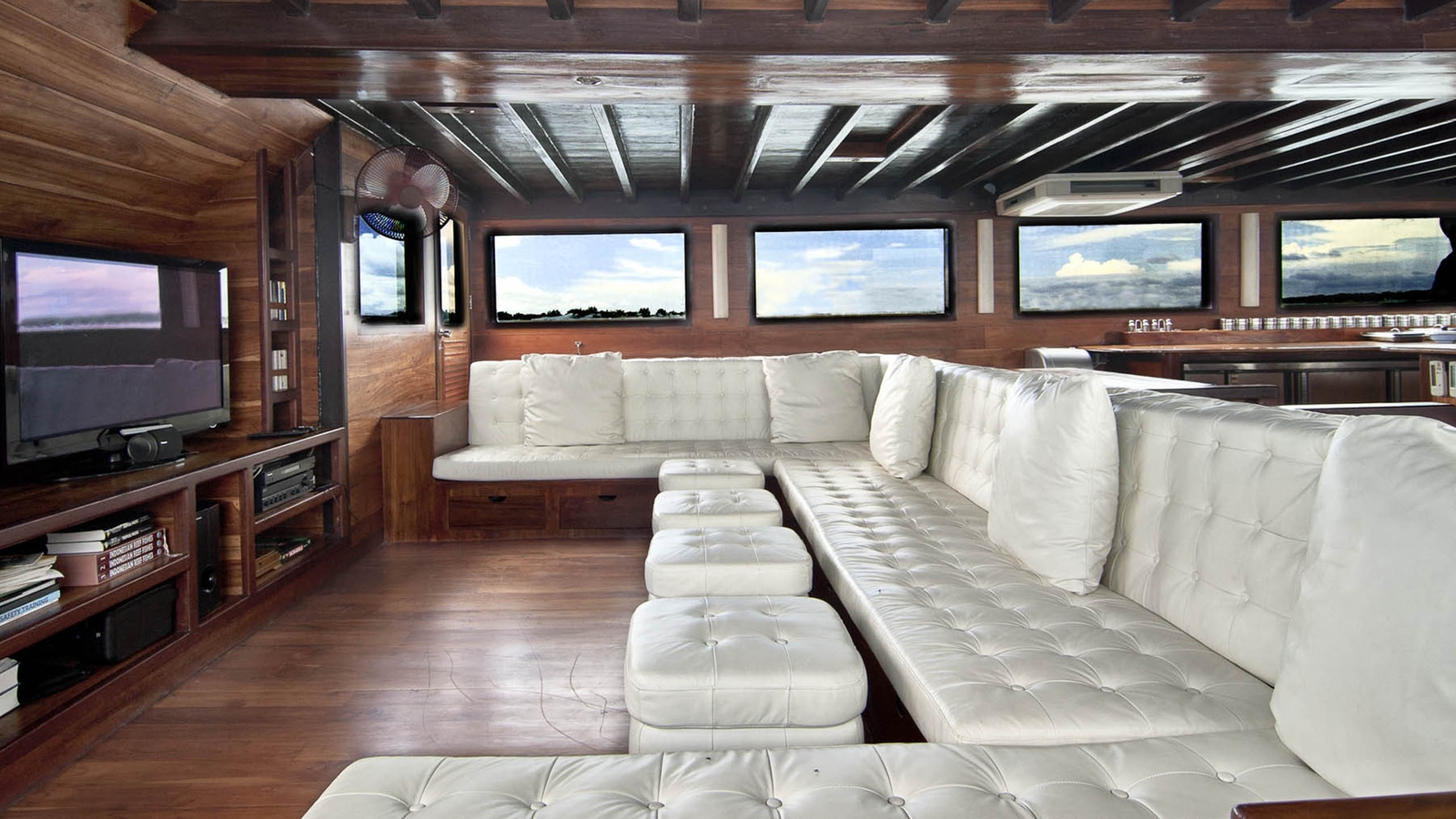 The 42 metres (138 feet) long Samata is a traditional wooden phinisi yacht on first appearance, but inside it is a thoroughly modern vessel with three decks, open-plan living and French inspired design.