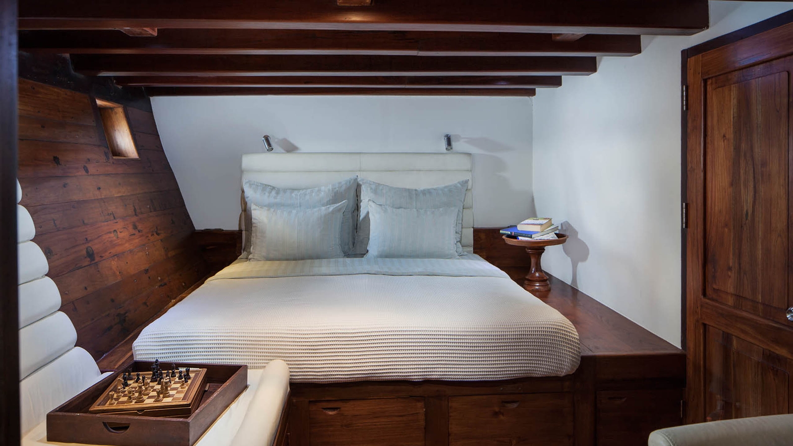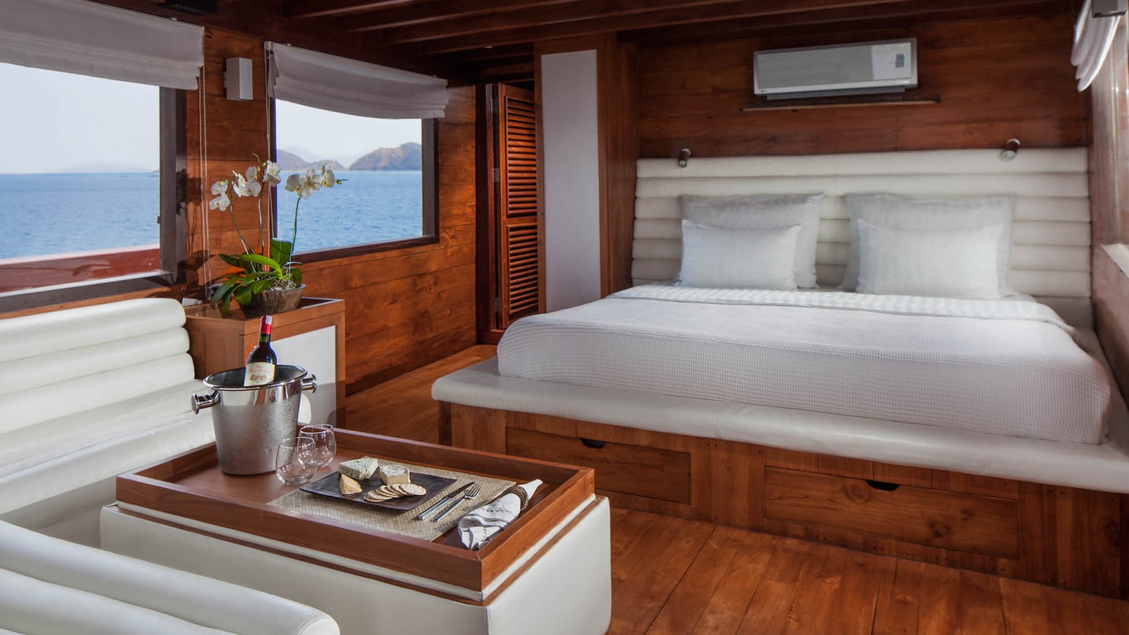 Five cabins accommodate up to 10 guests in comfort, each with en suite bathrooms and air conditioning. Four also come with sofa beds for families with children while the grand master suite is situated at the stern of the upper deck and has a king-size bed, 270-degree views through panoramic windows, a lounge area and a private sundeck.