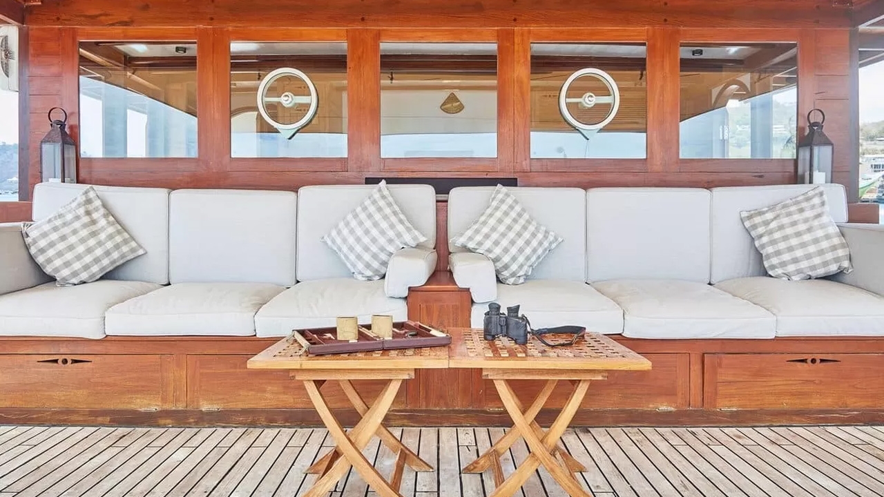 Spacious and elegant, the vessel features three en-suite cabins positioned above the deck. Large windows allow plenty of natural light and means guests can enjoy the wonderful views while cruising through the emerald waters. Cabins feature natural teak floors and a sophisticated colour scheme of cream with flashes of red.
