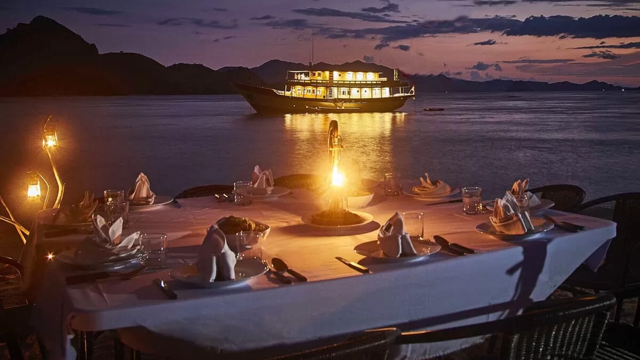 The wraparound deck offers 360 degree views of the water and the islands, and the large, airy lounge and bar area is perfect for congregating in the evenings with a drink. A combination of Indonesian and Western dishes are served on board.