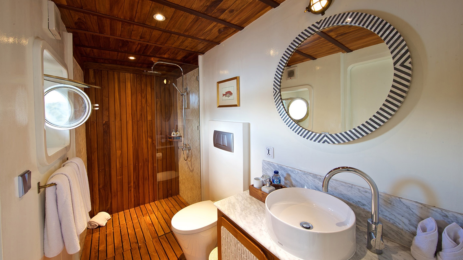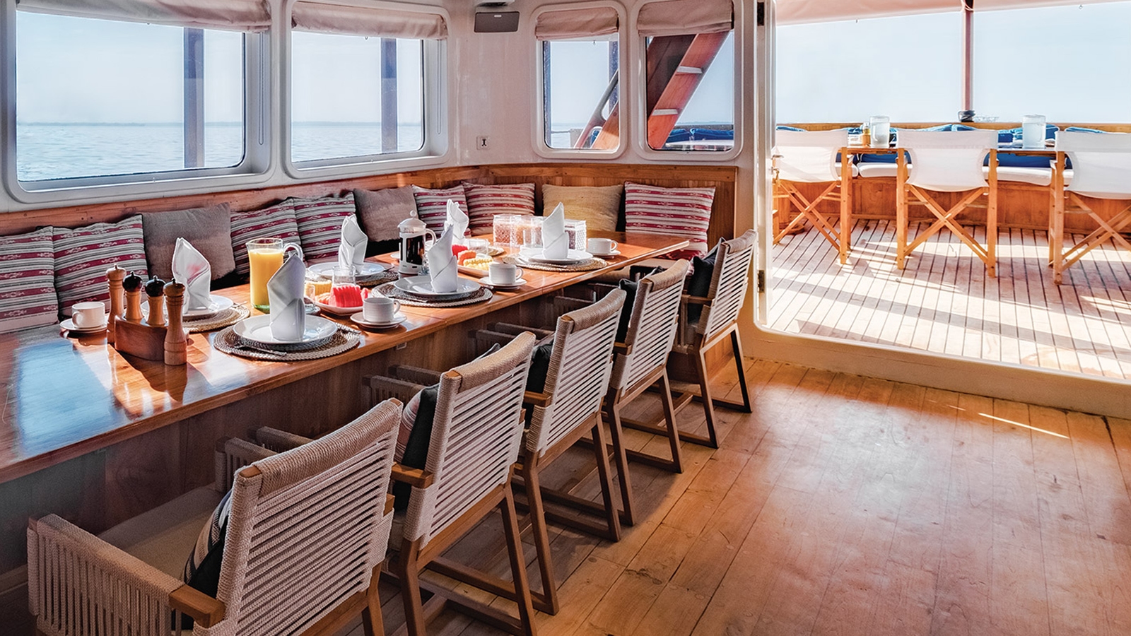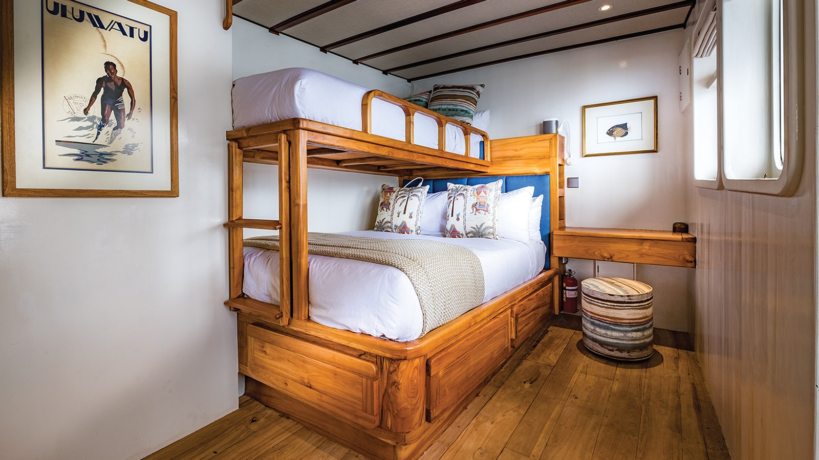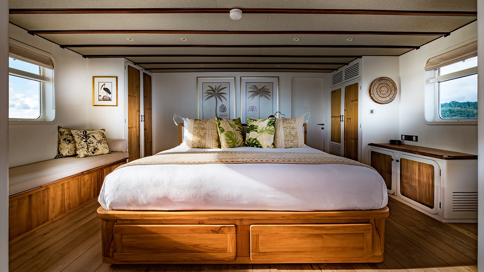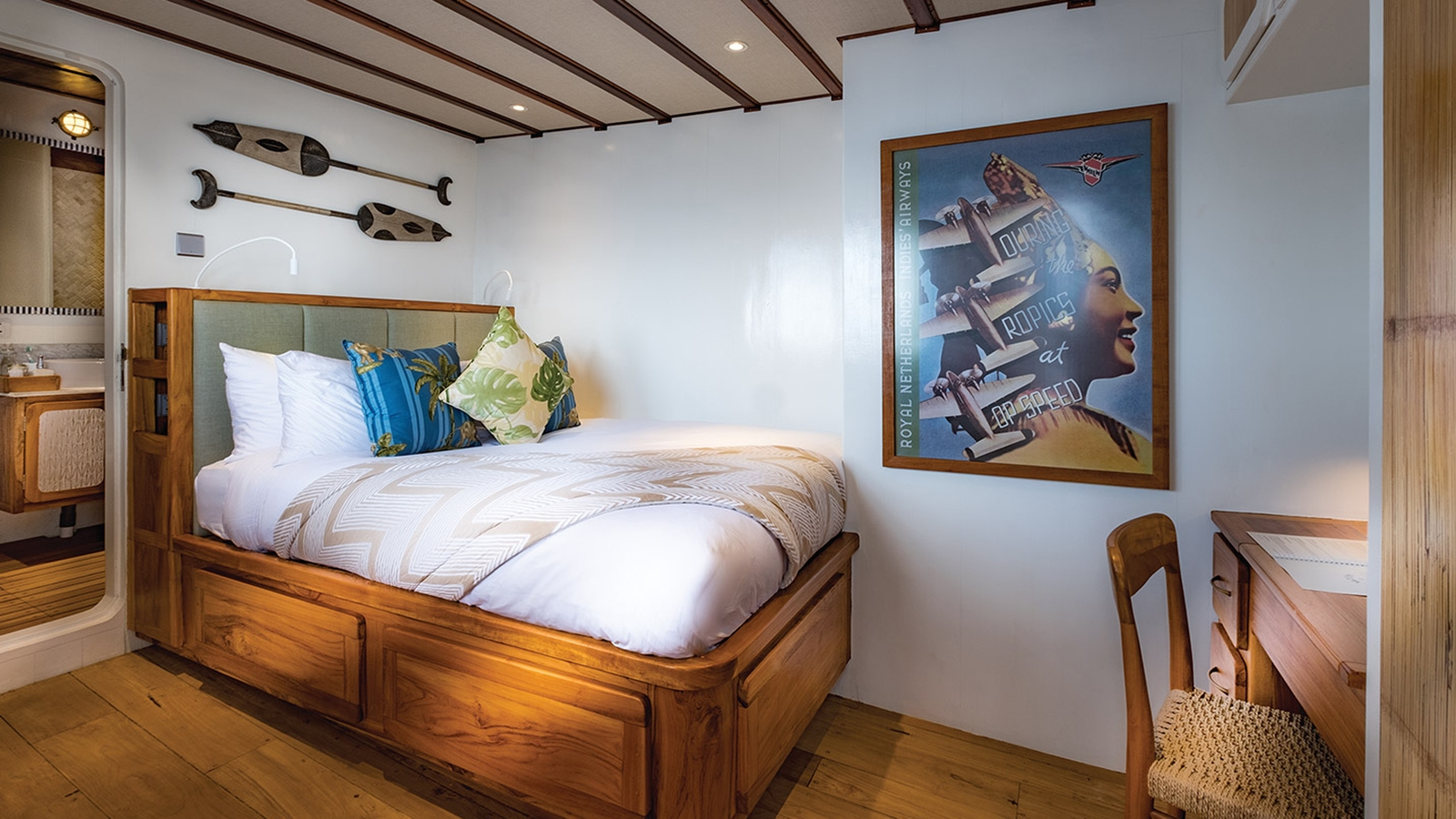 Each positioned above deck, with wooden furnishings, local artwork, and tropical patterns, the cabins are individually decorated. Spacious and airy, every cabin has air-conditioning, music systems and flat-screen TVs. Bathrooms are sizeable, with tailor-made fittings and hot water showers.