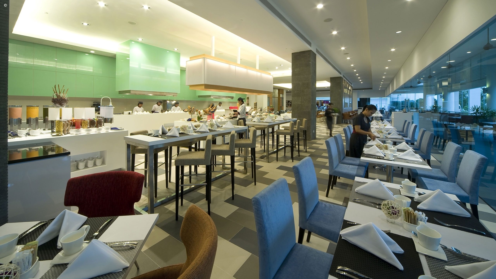 With 389 rooms there is plenty of choice for couples, families and groups. The five bars and restaurants include the Puzzle restaurant serving international buffet and al carte meals, while Nu Er Hong serves Chinese food. Liquid, the poolside bar, is popular spot in the evenings.