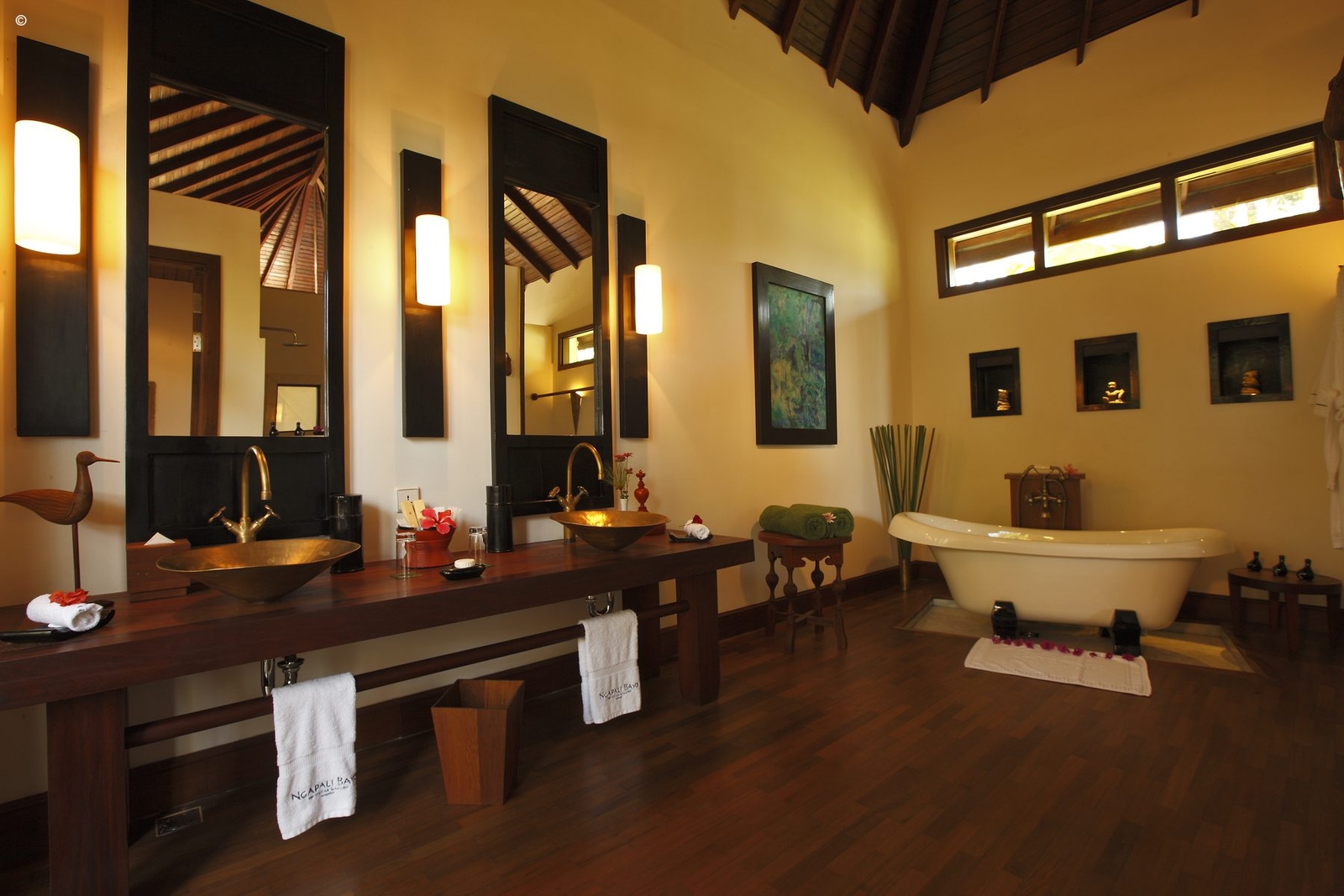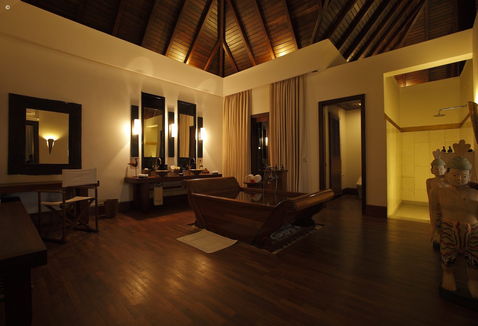 There are 32 air-conditioned villas that make up the accommodation, all with views of the water, and created with teak wood and marble. Each villa is full of unique antiques and artworks, with four varieties available: some have private plunge pools, whereas others are sat right on the beach.