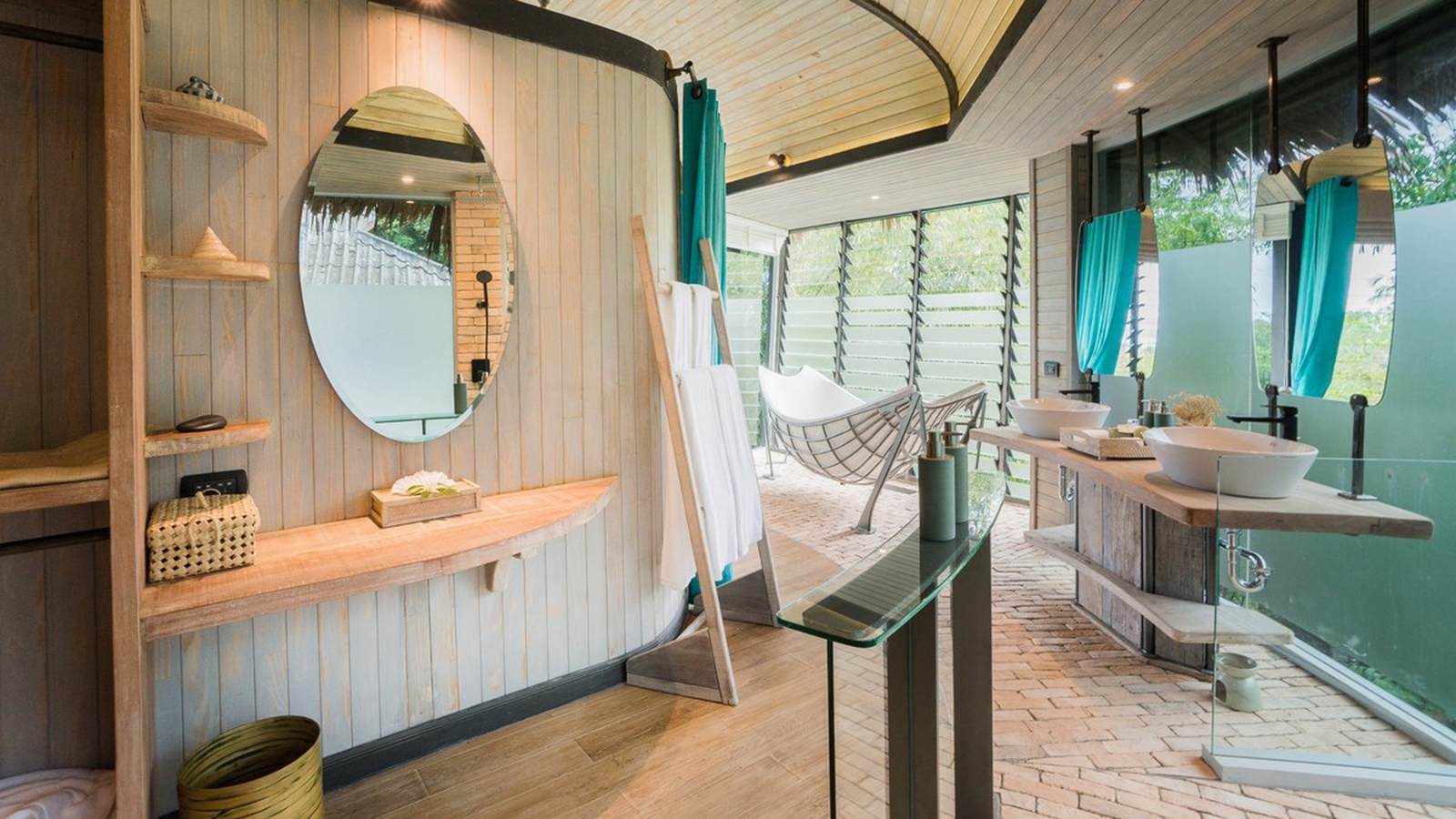 Cross a suspended bridge to reach your duplex treehouse which boasts an open-plan lower floor with a private plunge pool, dining area, personal bar, double swing and day beds. The villas are decorated in a shabby-chic style, incorporating colours and textures from the jungle and the sea. Upstairs, in the bedroom, a balcony looks out over the treetops. Soak in a hammock bath or refresh yourself in a jungle shower.