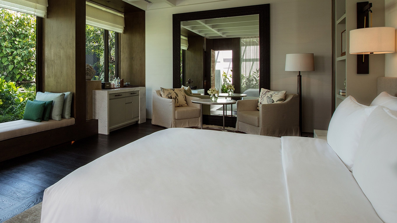 The hotel features 71 pavilions and villas hidden among the tropical vegetation just moments from the beach. Floor-to-ceiling windows flood rooms with natural light, and a soft neutral colour schemes gives a contemporary, fresh feel. All villas and pavilions come with private pools and outdoor space in which to relax.