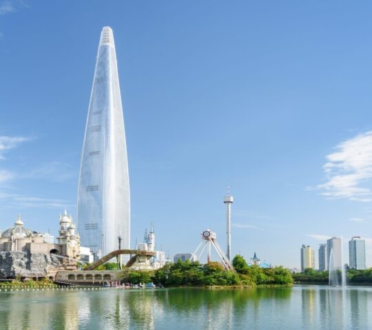 Visit the Lotte World Tower, South Korea’s tallest skyscraper and currently the world’s sixth tallest building. Ascend to the Seoul Sky observatory spanning floors 117 to 123, where the Sky Deck, perched at 478 meters, boasts the Guinness World Record as the highest glass-floored observatory globally.