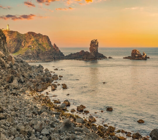 As you traverse its landscape, you’ll descend through lush forests, pass by villages crafted from dark volcanic stone and encounter the iconic dol hareubang grandfather statues hewn from basalt. Along its coastline, Jeju unveils a stunning vista of sheer cliffs, cascading waterfalls and pristine beaches, adorned with vibrant wildflowers, casting a spell of natural beauty. Nestled amidst this picturesque scenery are remarkable temples and lava tubes waiting to be explored.
