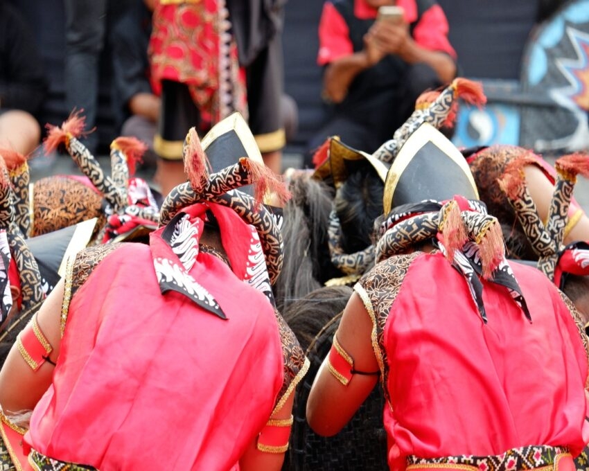 The Jathilan trance dance is the most eye-catching and dramatic dance in central Java. The dancer is attached to a flat bamboo horse and dances along with traditional music until he is entranced by wild spirits. He rolls on the ground several times, whipped by the dukun – the leader of the jatilan group. This man is the most important man in the dance; he must have the ability to control the trance dancer and at the end has to order him to stop and bring him back to conciousness. Locals usually arranged this performance when there is a ceremony to entertain their family, relatives and neighbours.