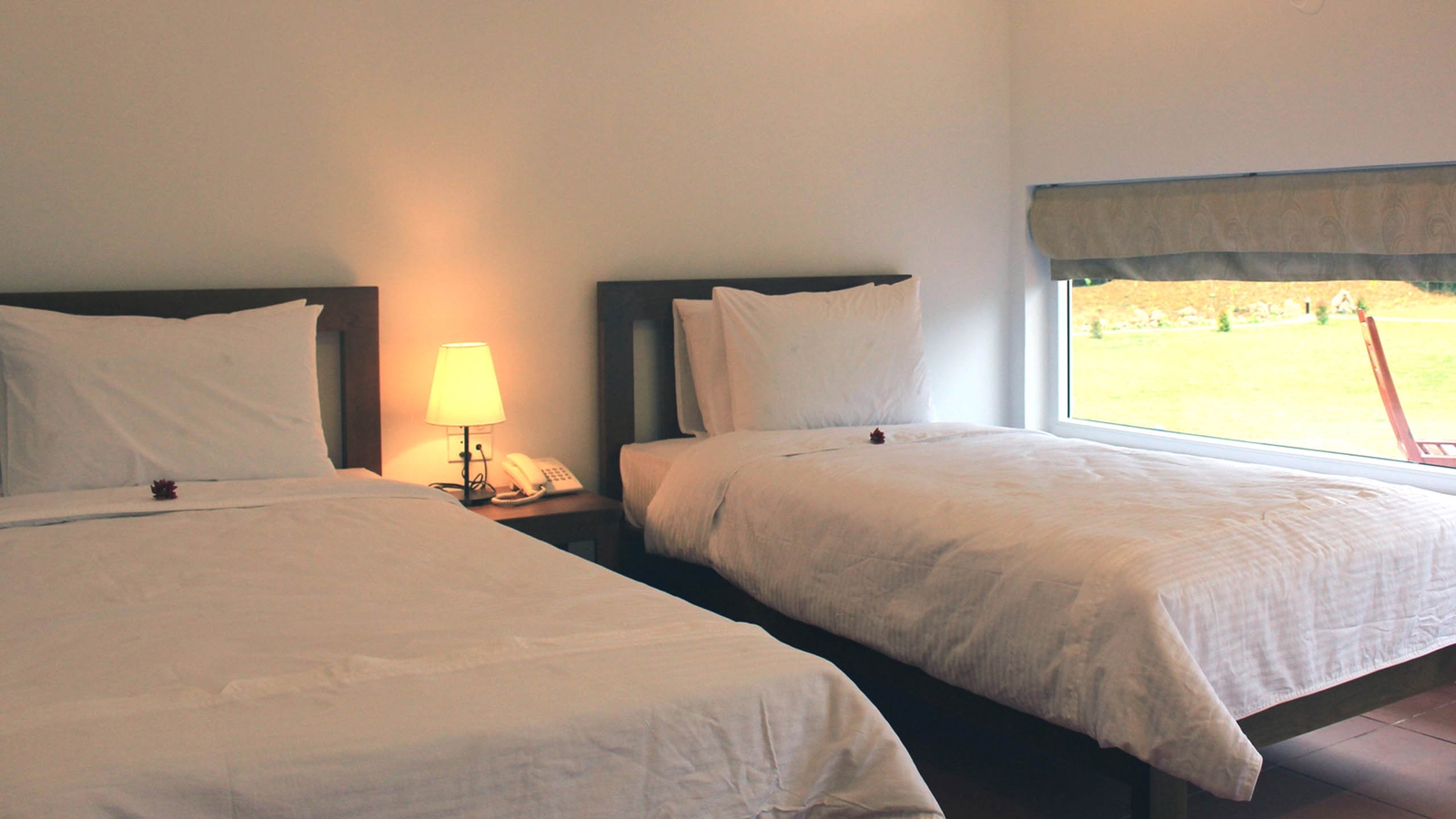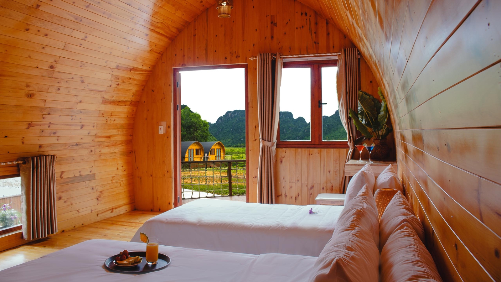 The 39 rooms, housed within snug bungalows and cottages, with some encompassing pinewood barrelled ceilings, rest at the base of towering limestone karsts surrounded by landscaped gardens and farm fields. Natural design elements along with light and airy interiors and large windows allow guests to feel immersed in the exterior environment.