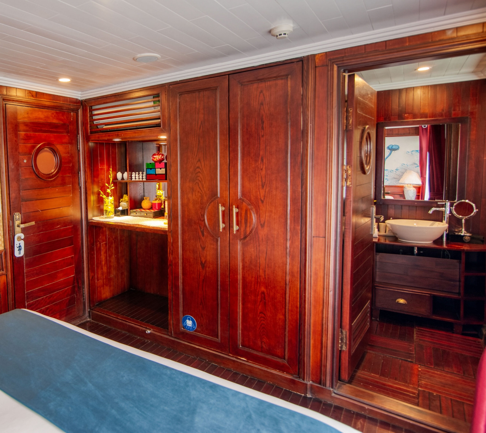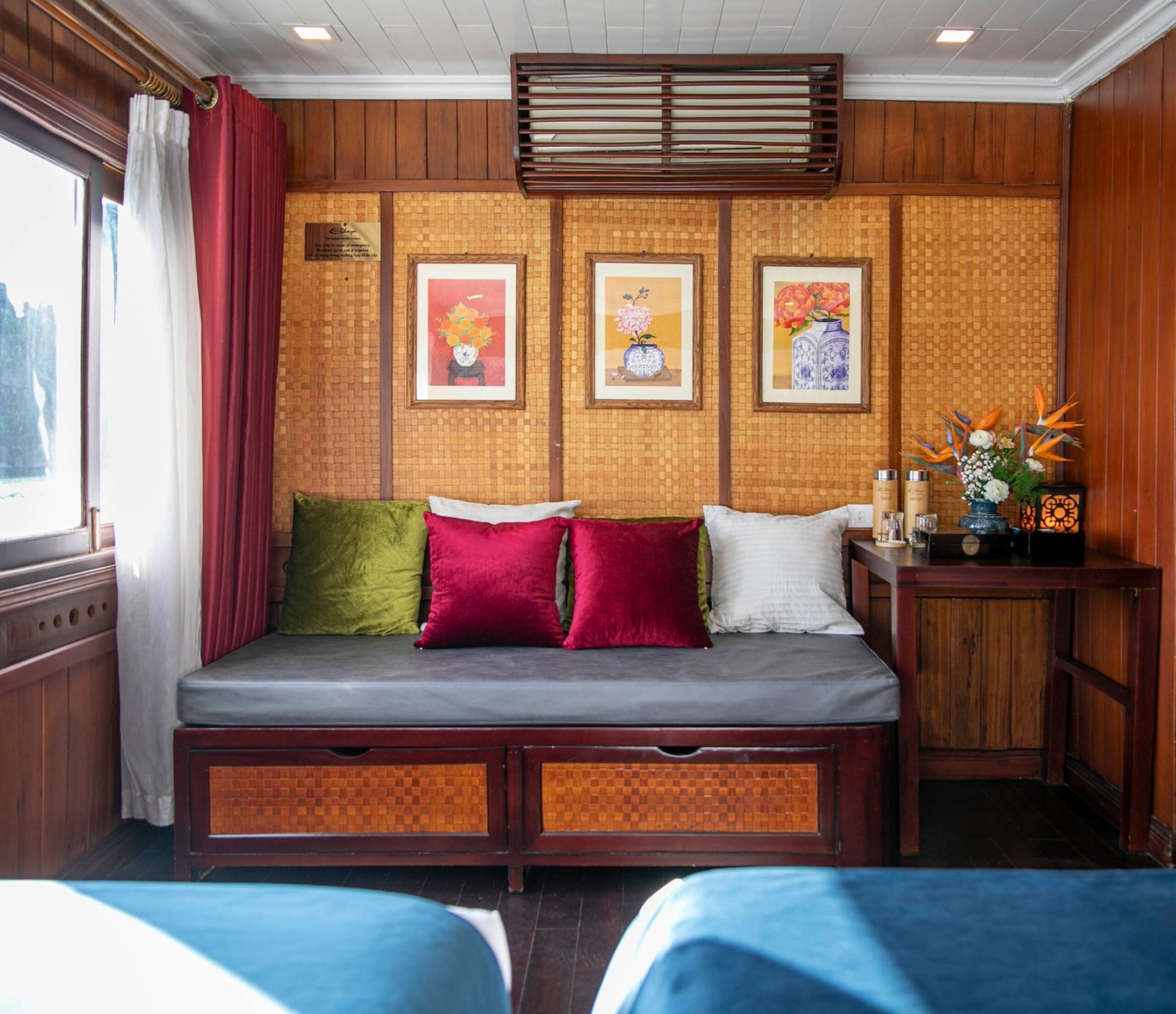 Sleeping four passengers in total, the ship’s crew of captain, chef, deckhand and hostess will be on hand at all times to fulfil your needs. The teak-lined cabins themselves may be modestly sized, but are furnished in an inviting contemporary-Vietnamese style, complete with double or twin beds, crisp linen, hot-water showers and air conditioning.