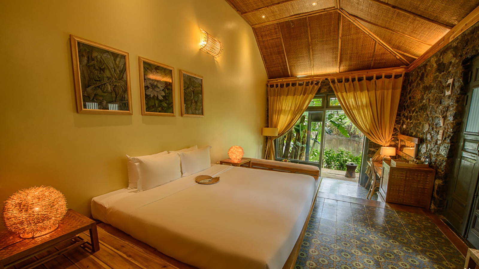 Offering a choice of 16 rooms that are spread across eight independent bungalows, they are set in the serene gardens of Tam Coc, enjoying natural aromas and verdant views filled with local flora. Each room has its own private terrace, offering vistas of limestone karsts or sprawling rice fields, while the interiors are spacious and tastefully decorated, utilising features such as stone, wood, traditional tiles, bamboo and ceramics to create a natural and authentic character to each room. That sense of authenticity spreads throughout the resort, with the construction designed to resemble a traditional Tonkinese village, with its typical stone houses and tiled roofs.