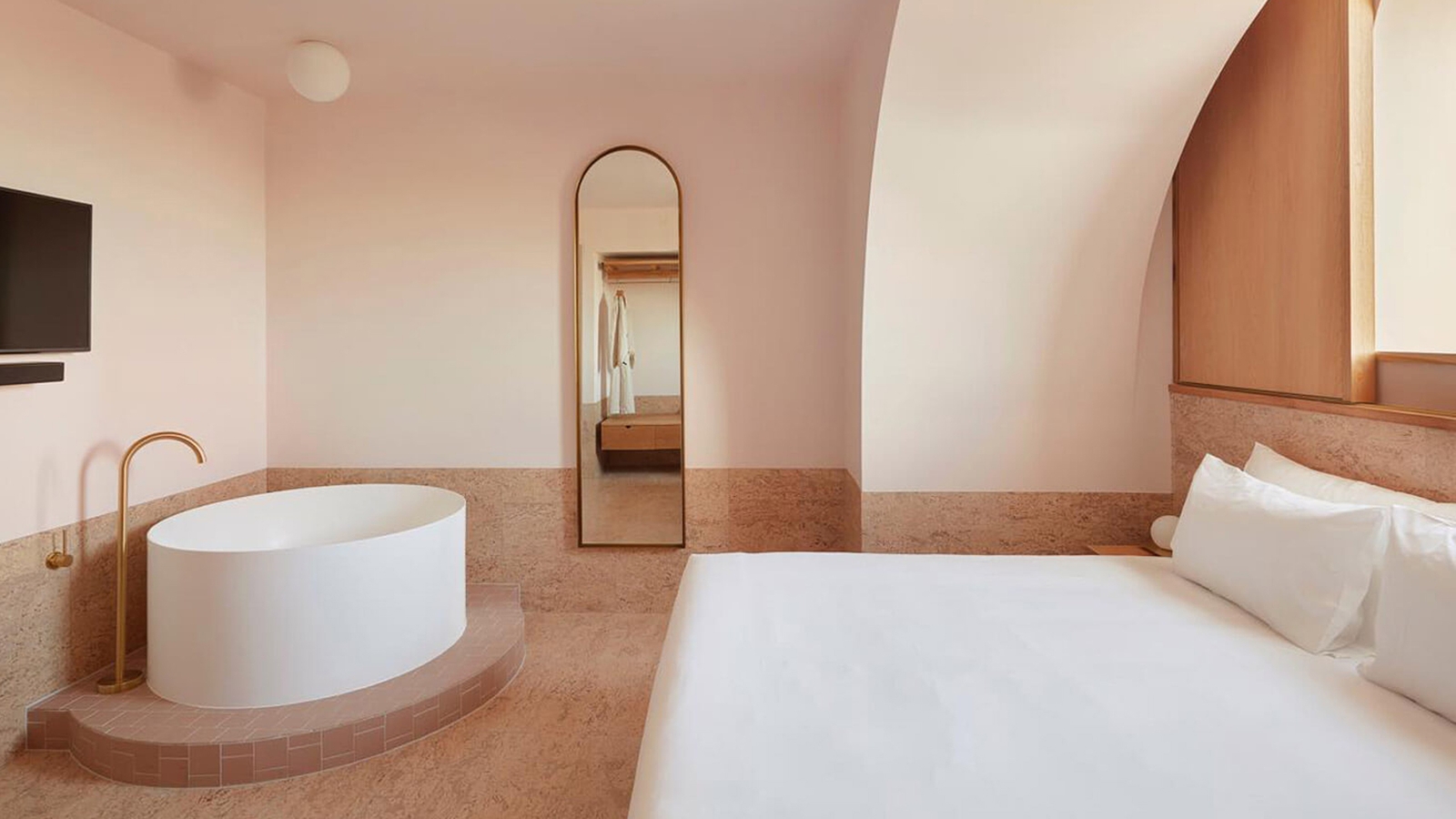 There are 175 rooms, with views of the city or the pool, and some encompass private balconies and separate living areas. Décor pays homage to 1950s Miami, and airy spaces are enhanced with partially cork-panelled walls, marble flooring, and oak features. Deep, circle-shaped baths, with brass taps, sit in the middle of the rooms, or by the windows, offering dreamy vistas over the treetops.