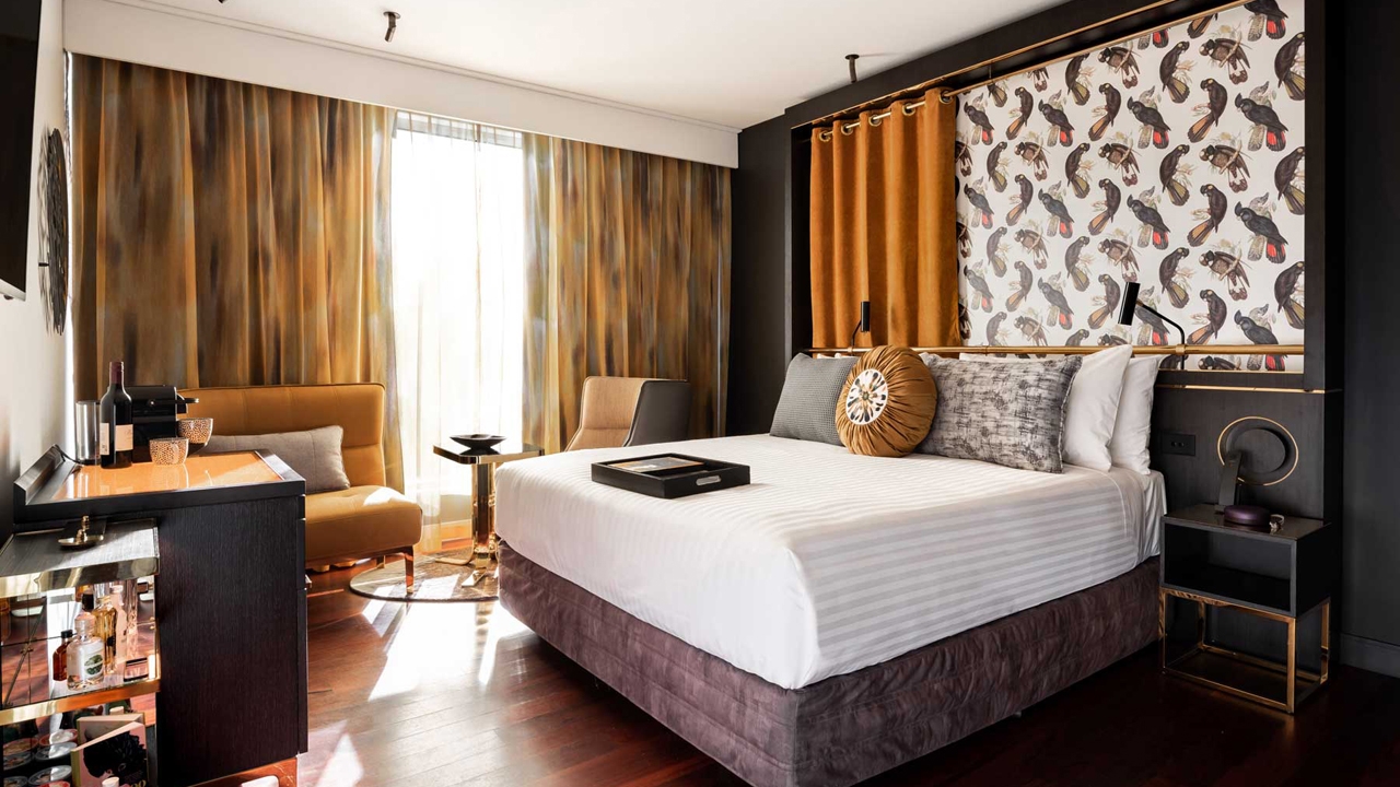 There are 184 rooms to choose from, all boasting lavish decor and finishes. Think local jarrah timber, rich velvet, polished brass and black cockatoos. The design throughout the hotel neatly combines industrial glamour and luxurious detail. Dark stone bathrooms, rich colours, bold prints and Patsy Payne sculptures add a hefty dose of elegance.