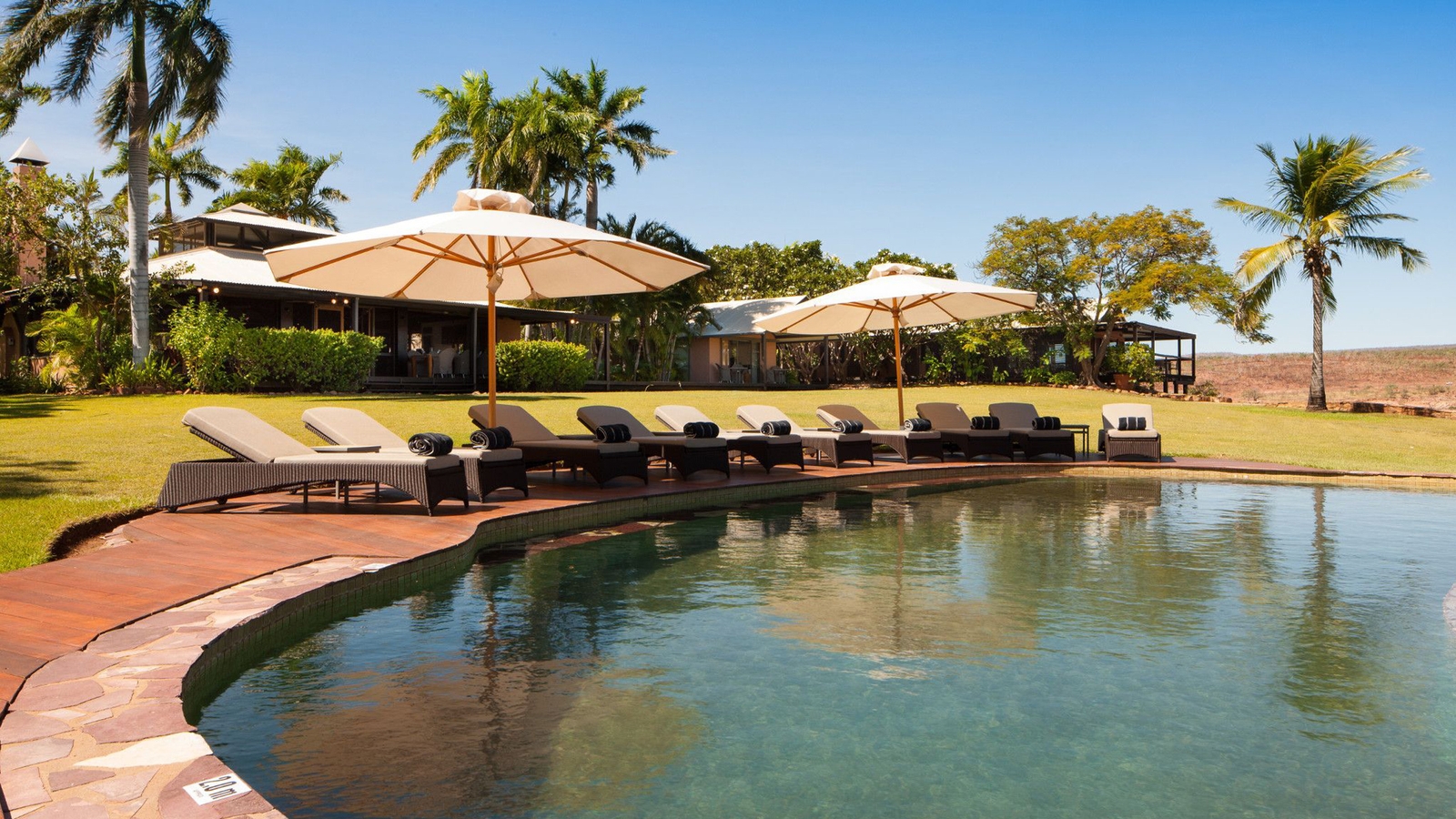 Over 100km from the nearest town, this is wilderness luxury at its best. The homestead caters a maximum of 18 guests in luxurious comfort that starkly contrasts with its rugged surroundings of salt plains, thermal springs and rust-coloured cliffs. Each of the six rooms ensure the utmost privacy, are surrounded by lush tropical gardens and have spacious ensuite bathrooms.