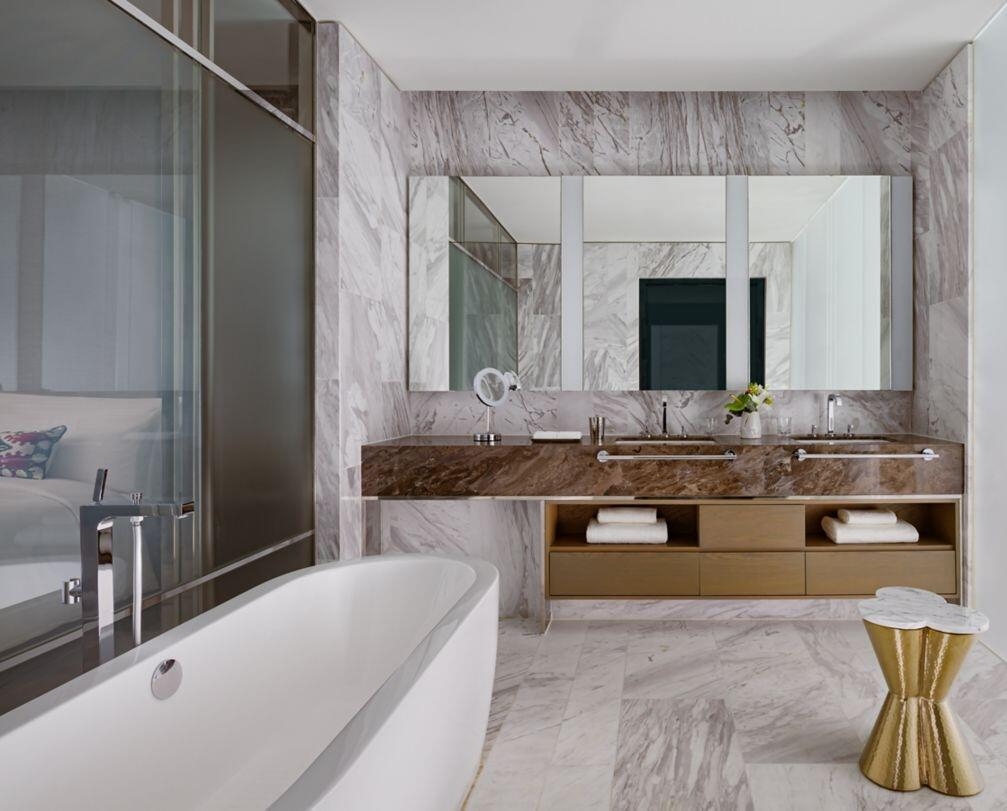Close to the historical Sherq Bazaar and the strikingly modern Heydar Aliyev Cultural Centre, the sky-scraping Ritz-Carlton is bright and airy with a soothing neutral colour scheme with pops of bold colour. The furnishings are all clean lines and contemporary elegance, and the large picture windows in every room, suite and apartment offer incredible birds eye city views. Bathrooms are opulent: marble floors, walk-in showers and standalone bathtubs.