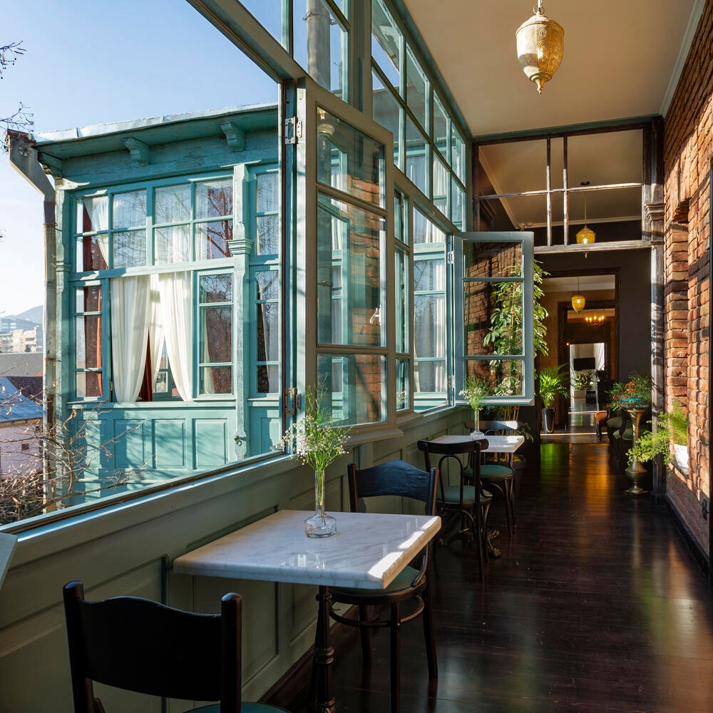 Rooms and suites have high ceilings and vintage lighting, and you can enjoy home comforts, like window seats, armchairs and rattan outdoor furniture on balconies. In the stylish bathrooms you can enjoy walk-in showers with water-efficient rainfall shower heads. The ground floor is home to the Unfound Door gastro-bar where Georgian-European cuisine is served using locally sourced produce, and vegetarian and vegan options are available. At the end of a long day, settle into a tall chair at the low-lit bar and enjoy a hand-mixed cocktail or glass of wine from the curated list.