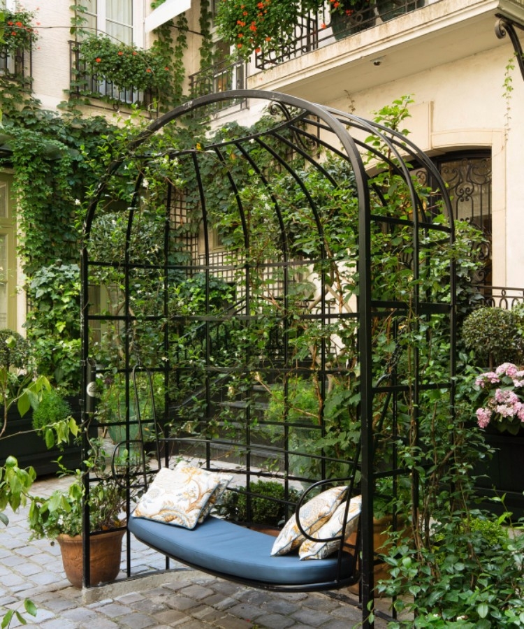 A paved courtyard sits between the front and back buildings and leads to the entrance. A beautiful garden, accessible to only a few hotel guests, is a real oasis of calm where greenery is laced across the walls and flowers tumble from the balconies above.