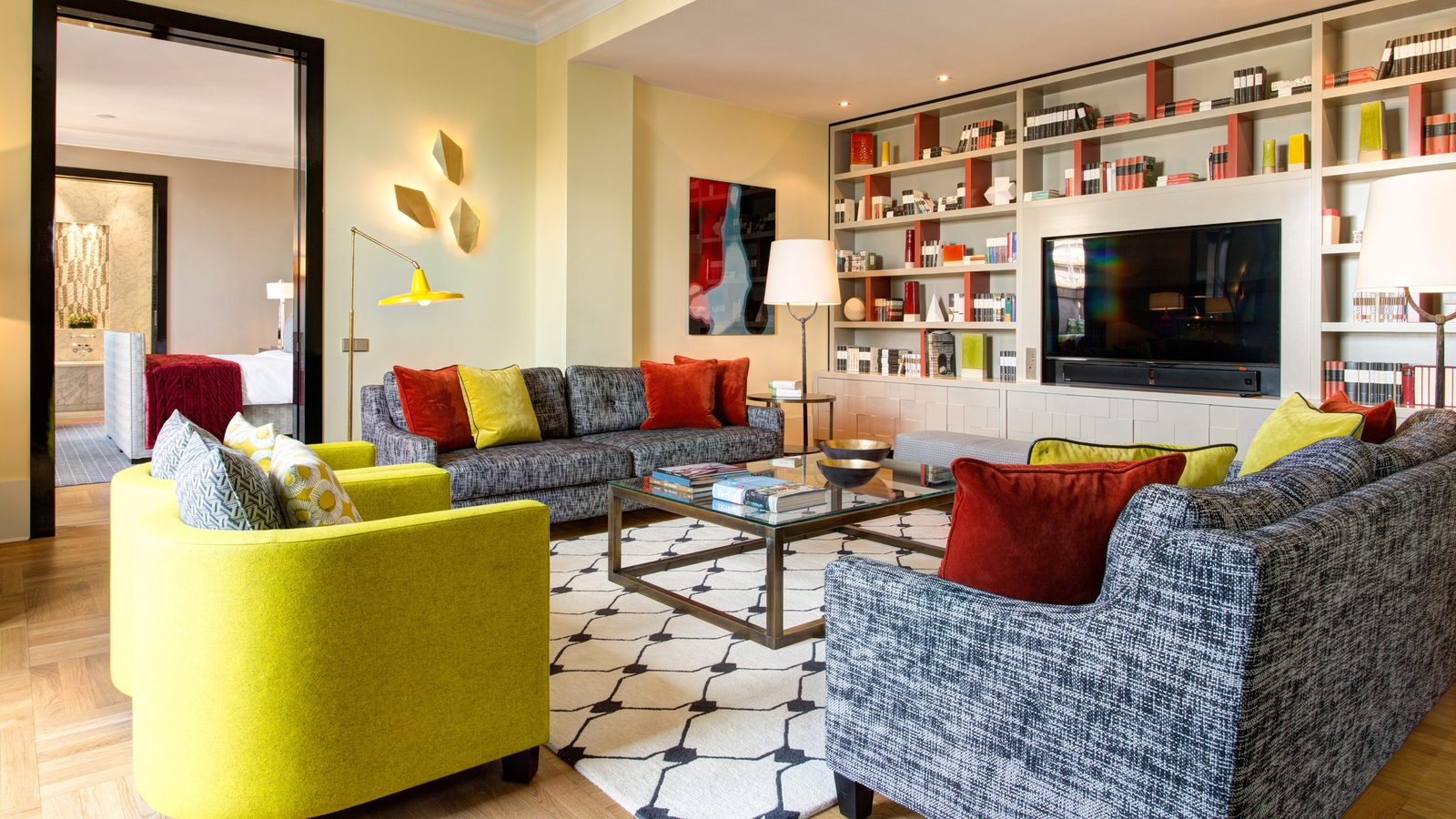 Upon arrival, the ground-floor reception serves as a striking entrance, with pink neon birdcages hanging from the ceiling and roomy black velvet sofas set alongside cherry-red furnishings. The refined interiors of the rooms and suites are somewhat more neutral, apart from pops of colour and vivid art paintings. High stucco ceilings and marble bathrooms add to the sophisticated atmosphere, and the polished suites encompass balconies, looking out over the square.