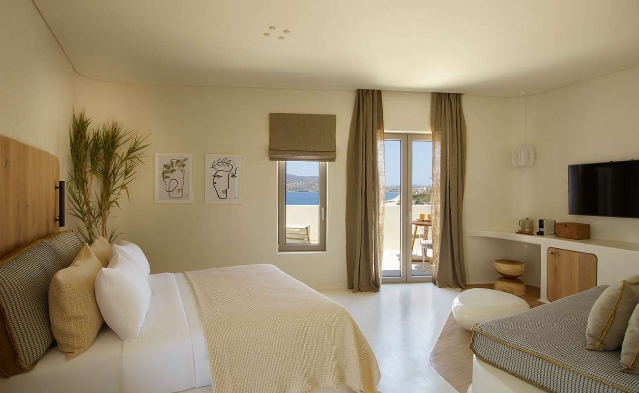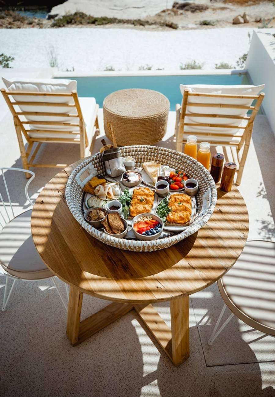 Blending traditional craftsmanship with contemporary design, White Pebble Suites blends into its beautiful beachfront surroundings in the coastal village of Pollonia. Created using local materials, like polished cement, cool marble, and warm wood, this boutique hotel is sympathetic to the timeless architecture of the Greek islands. There are 12 suites at the hotel over 3 different categories, all with private terraces to soak up the sea views and 8 suites have their own private plunge pools. Screened by fragrant borders of Mediterranean plants, the couple friendly suites emerge organically from the surrounding landscape with smooth curves and pale colour palette. Tactile glassware and ceramics, and earth-toned textiles create an ambience of easy-going warmth and effortless luxury.