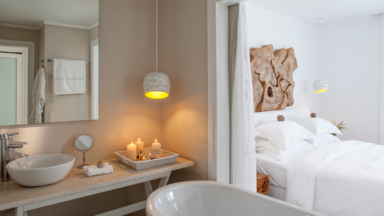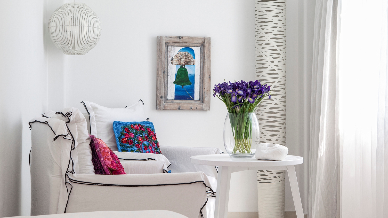 The 110 rooms are understated and elegant, and the design is inspired by the island’s heritage. Enjoy panoramic views of the Aegean Sea and Elia Beach from your private balcony or terrace, or unwind in a seawater infinity pool or Jacuzzi. Rooms are spacious and include all the modern features you would expect from a luxury resort.