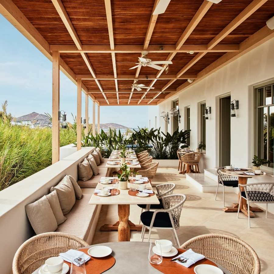 For dining, Volta Restaurant serves delicious breakfasts every day. Enjoy Parostià restaurant’s location overlooking the beach and shimmering sea as you savour delightful and traditional Parian cuisine. There is also the open-air setting of Vrosi, where you’ll indulge in exquisite traditional Greek recipes lovingly prepared using the finest local ingredients, all the while surrounded by the aromas of rosemary and lavender from the Cycladic garden.