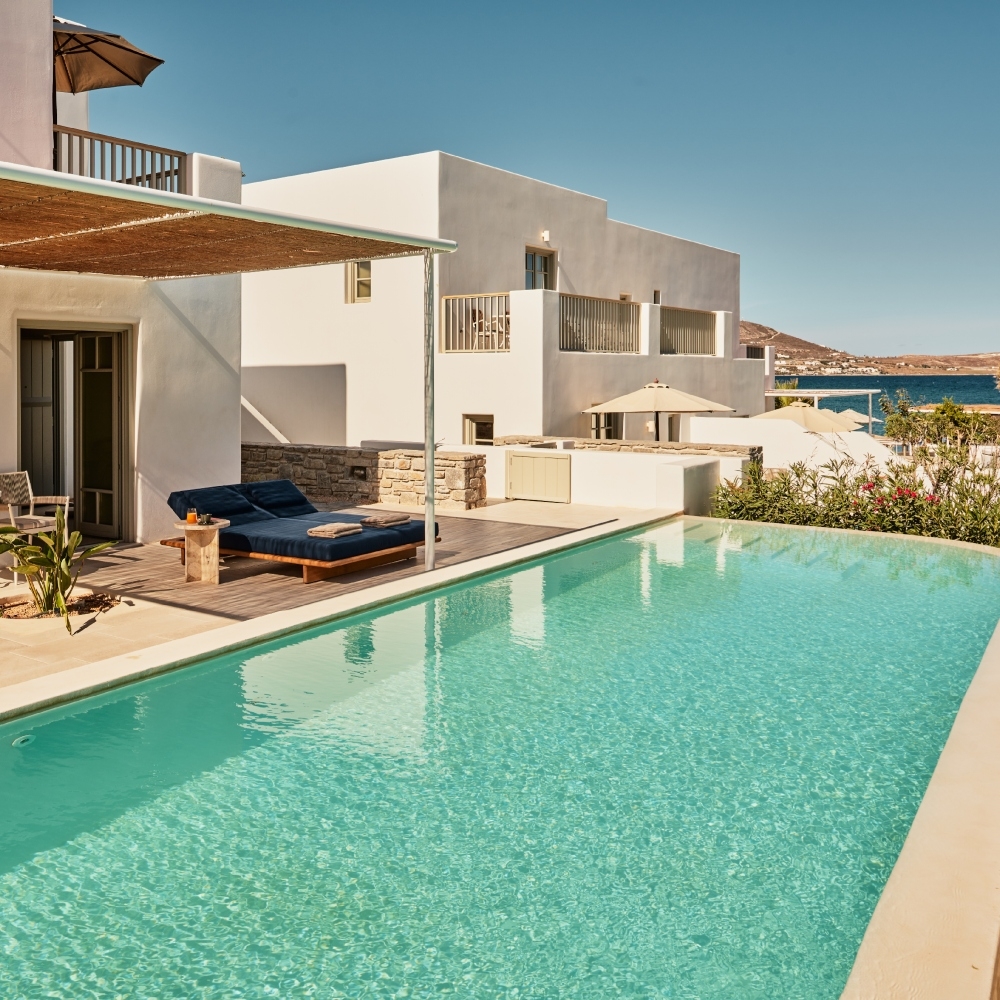 Myconian O is an oasis of unrivalled elegance that invites you to immerse yourself in its tranquil ambience and revel in the essence of Greek island living. Located within the embrace of majestic cliffs and shielded from strong winds and waves, Myconian O is an outstanding destination in Mykonos – one of the best Mediterranean islands.