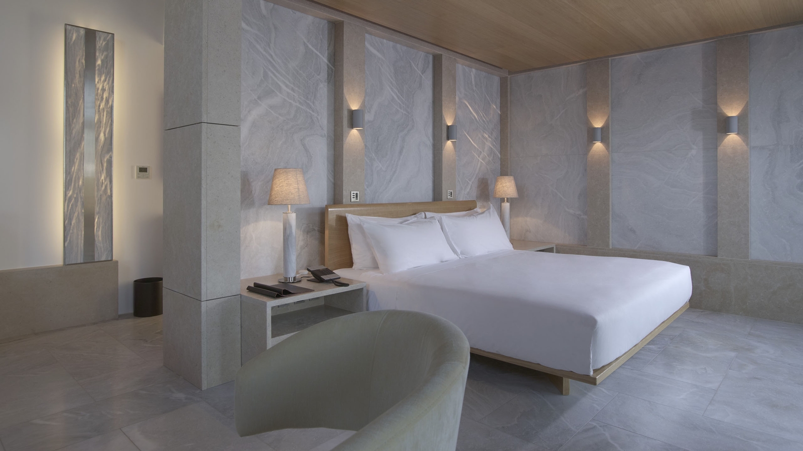 There are 38 pavilions dotted along the hillside, each private and elegantly luxurious, opening onto terraces with private plunge pools and views of the surrounding land or sea. Each pavilion is accessed via a stone-walled courtyard, leading to a living area and king-size bed in a marble alcove. For friends and family groups, there are a collection of spacious four to nine-bedroom villas with their own chef and host.