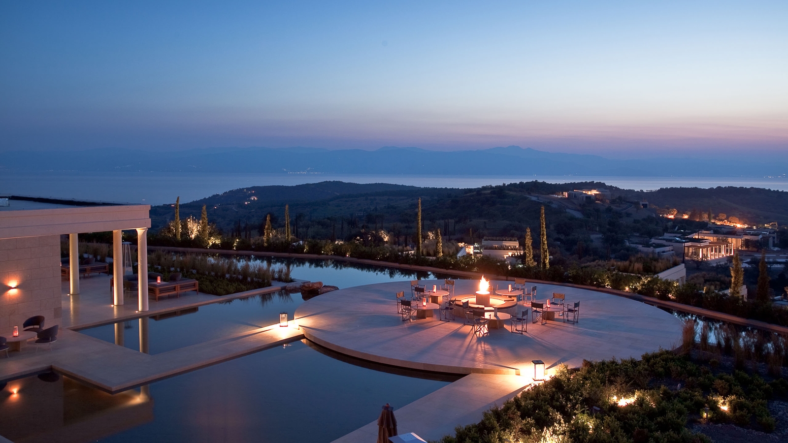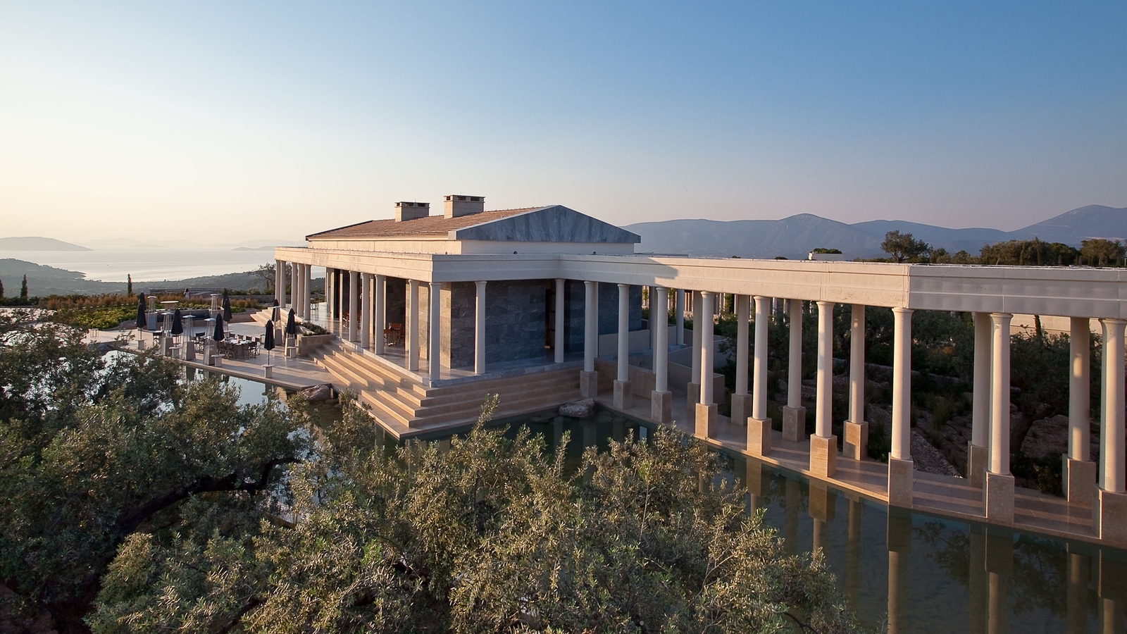 Sat atop a hill surrounded by undulating olive groves, Amanzoe is a 21st-century neoclassical temple with incredible panoramic views over Argolis and down to bustling Porto Heli below.