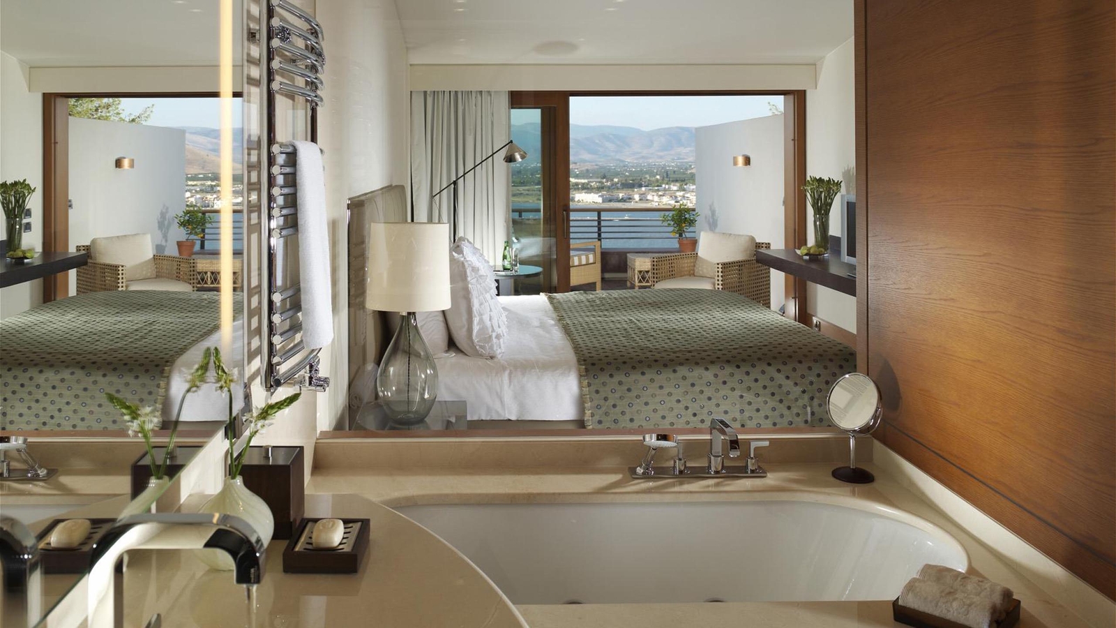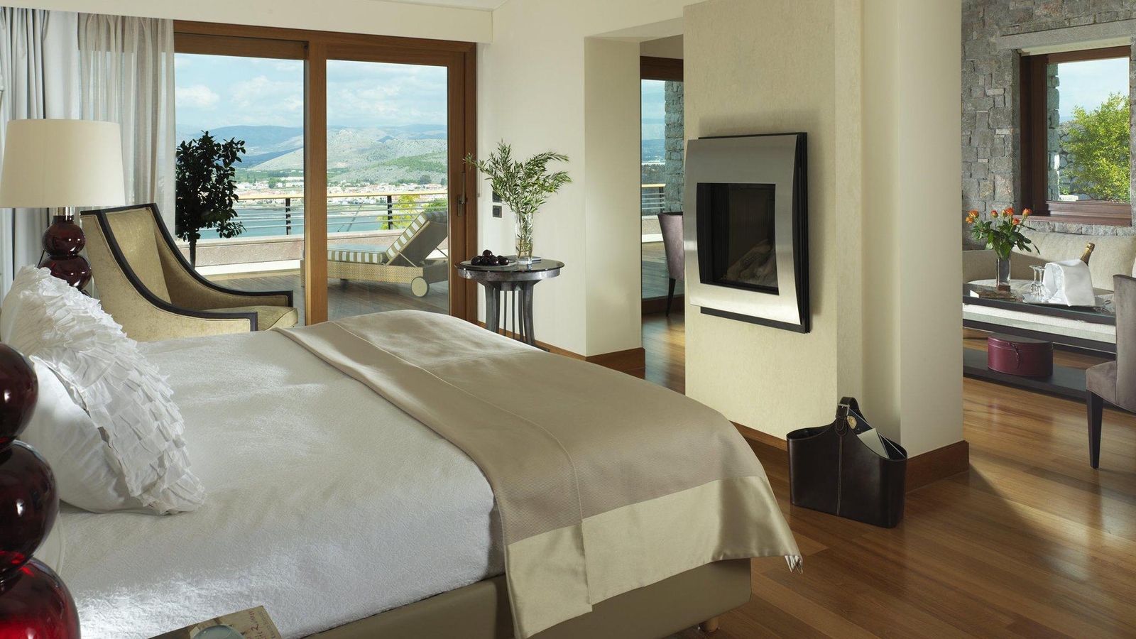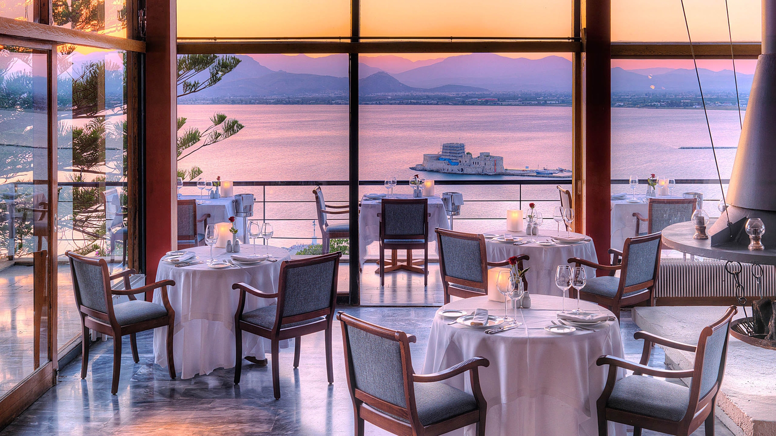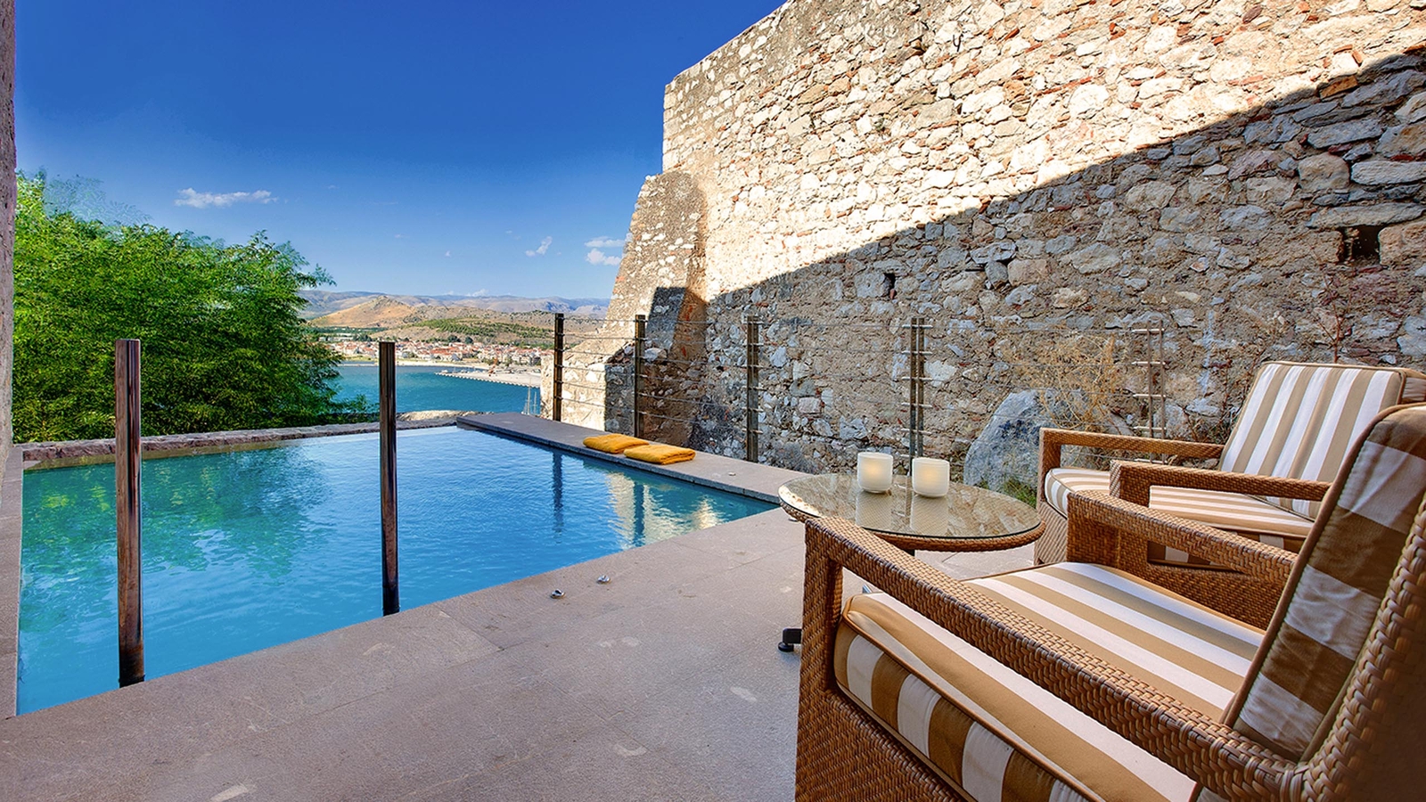 The hotel has 51 rooms and 33 individually designed villas, many with private heated pools or outdoor Jacuzzis on terraces, looking out to the Bay of Argolis. While exteriors blend into fortified city, the style inside is decidedly modern and airy. If you don’t happen to have your own pool, the Nafplia’s dramatic infinity pool more than makes up it.