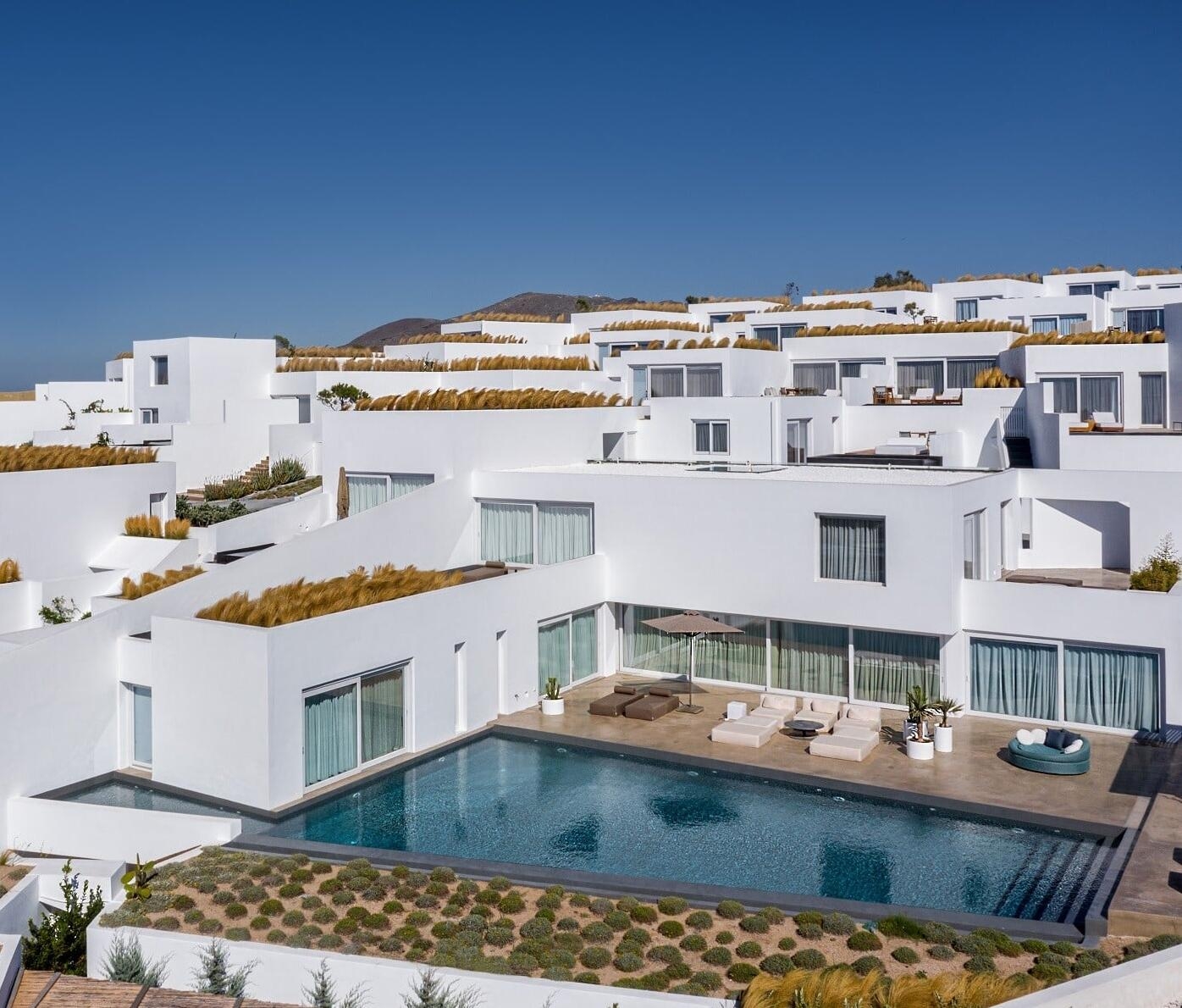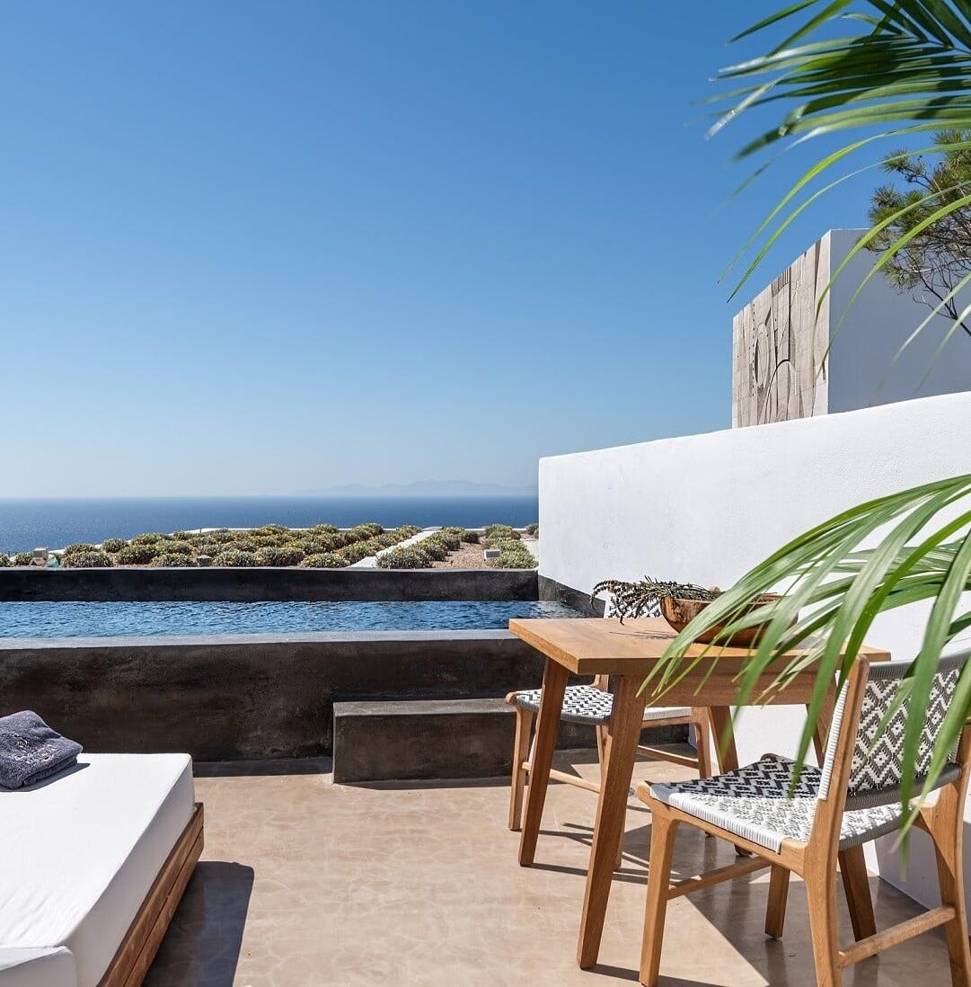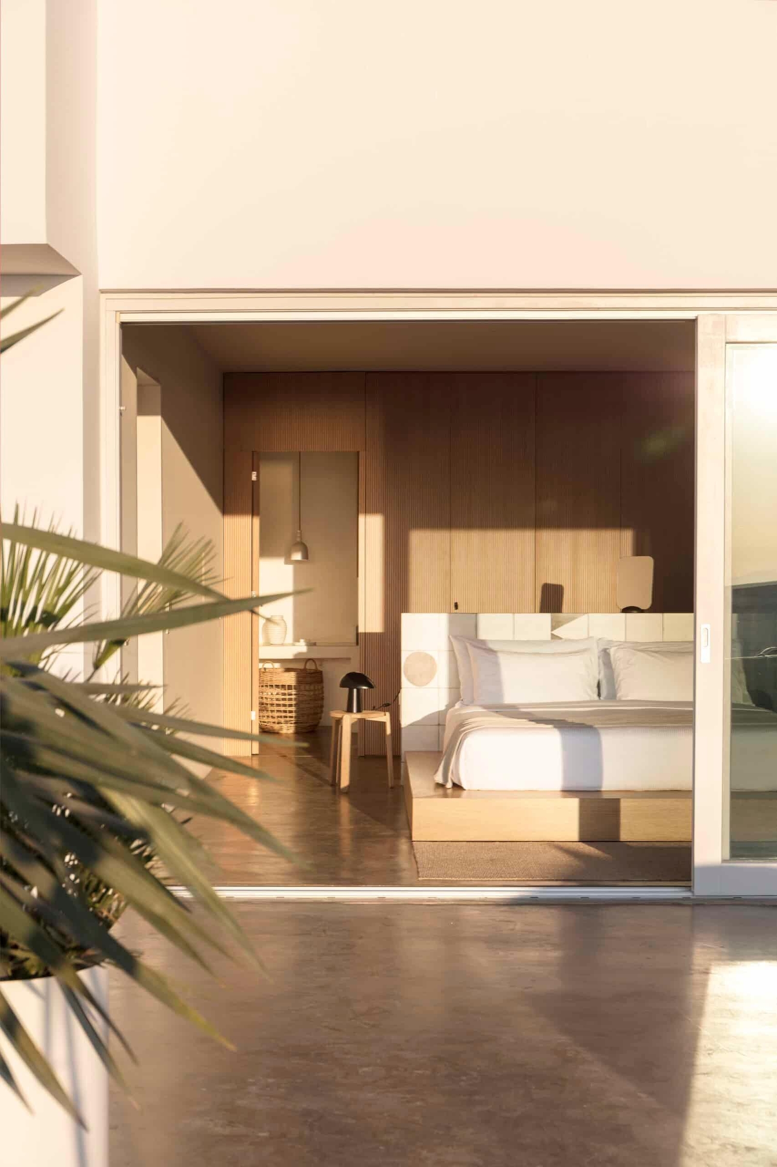 Each room and suite is curated with natural materials, handcrafted Greek artwork and a colour palette inspired by he surrounding sea, sand and olive groves. Some feature private pools, while others open onto terraces that frame uninterrupted views of the horizon.