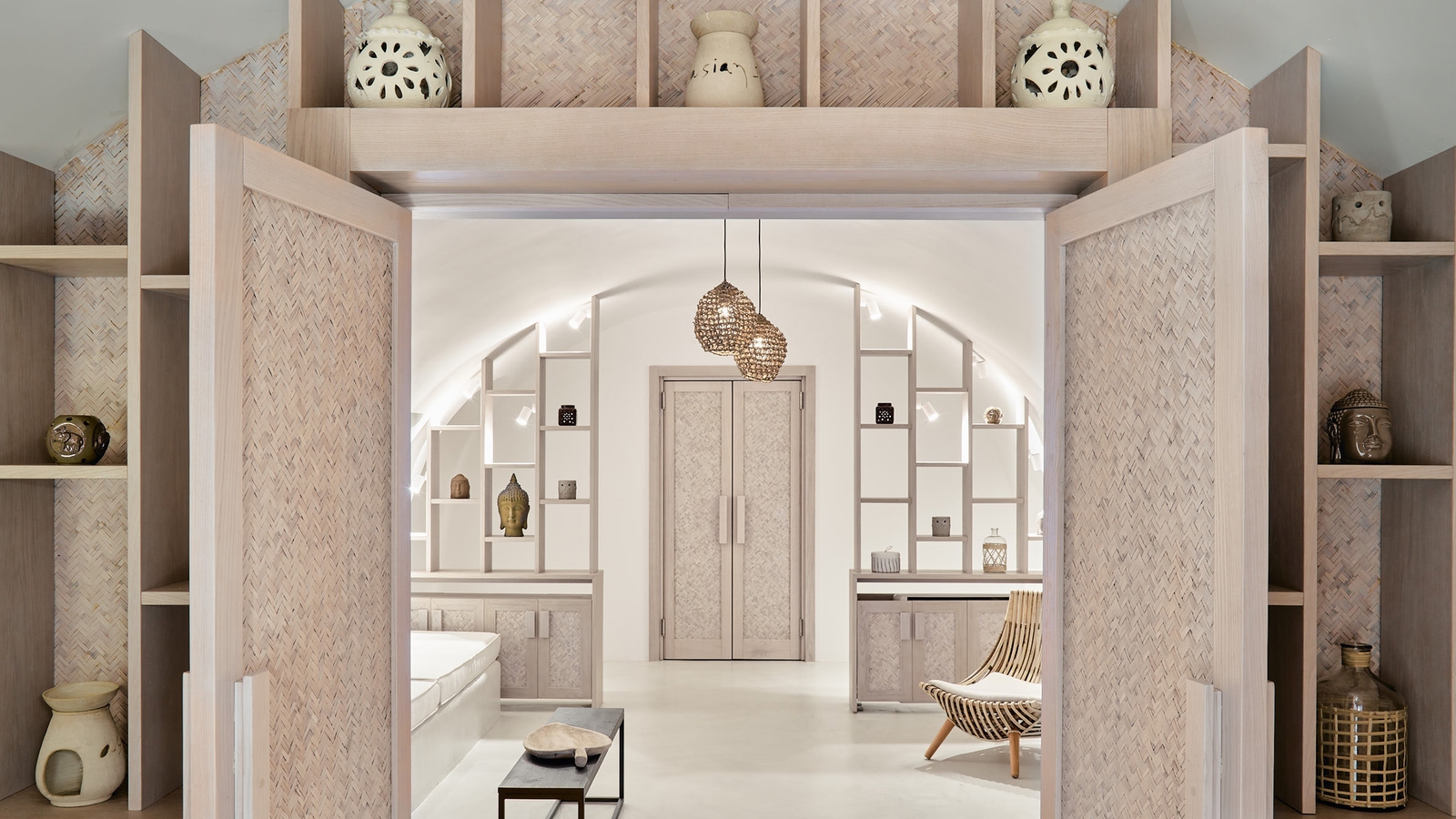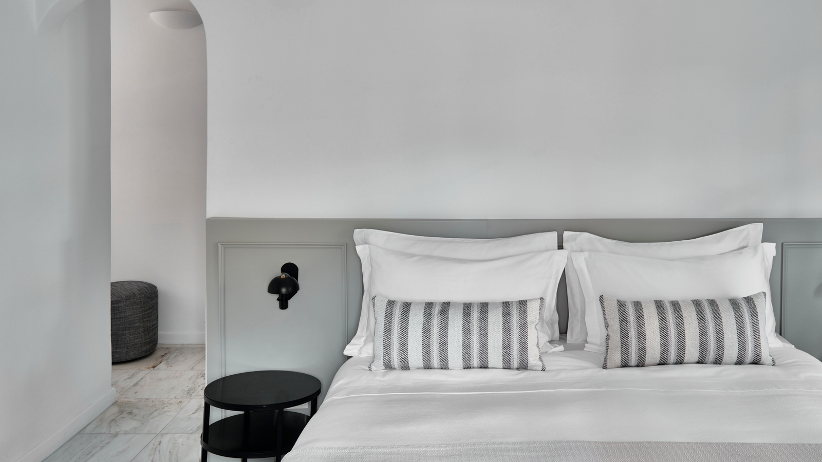 Each room and suite is curated with natural materials, handcrafted Greek artwork and a colour palette inspired by he surrounding sea, sand and olive groves. Some feature private pools, while others open onto terraces that frame uninterrupted views of the horizon.