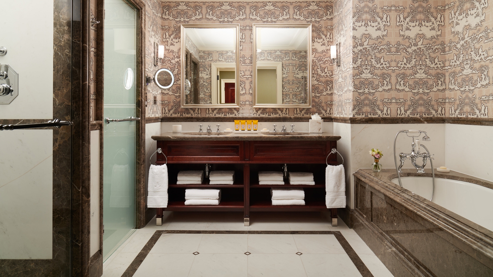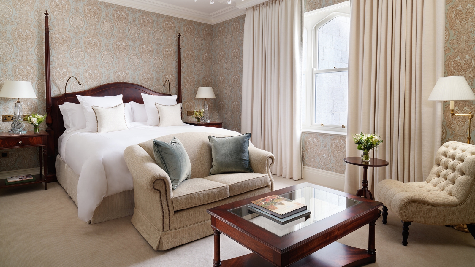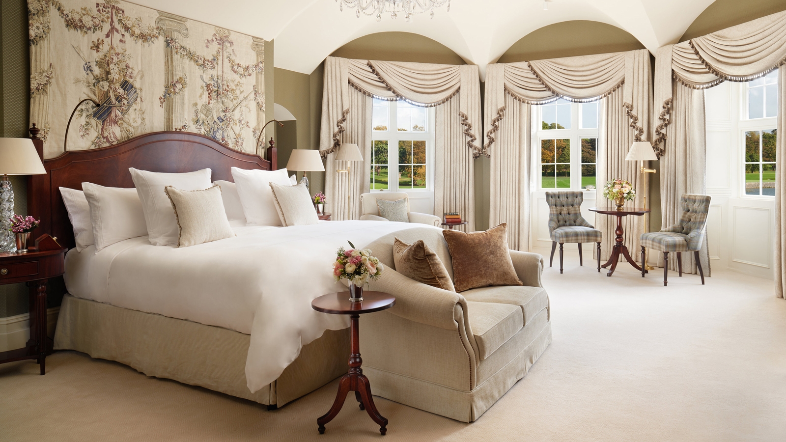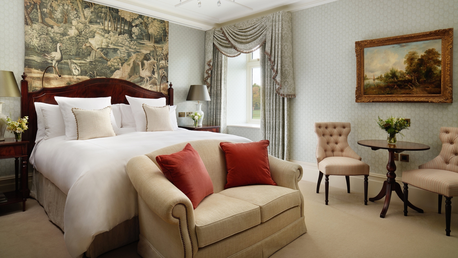 The hotel’s rooms and suites are traditional and elegant in design with beautiful artwork, marble bathrooms and views of the gardens, river, golf course or courtyard. There are plenty of options for food and drink, from formal dining at The Oak Room and The Carriage House to light bites, craft beer and whisky at the Tack Room. The Drawing Room which overlooks the formal gardens is where you’ll enjoy breakfast and can indulge in afternoon tea.