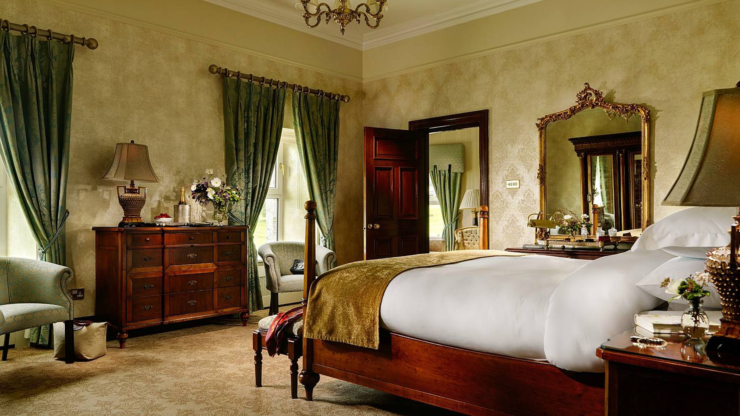 The 46 bedrooms and suites evoke a wealthy 19th century manor and are all vastly spacious, some with uninterrupted views of the dramatic West of Ireland landscape and some with views of the River Corrib, Lower Lough Corrib, Connemara, and the 18th Century Abbey and Walled Garden.