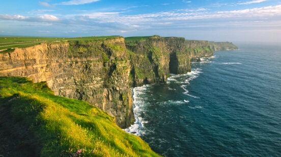 The Cliffs of Moher are among the country’s most impressive sites, with 14 kilometres of staggering cliffs plunging down into the ocean. Near their highest point you can visit O’Brien’s Tower, which gives you even greater views of the nearby mountains, the Aran Islands and the Loop Head lighthouse.