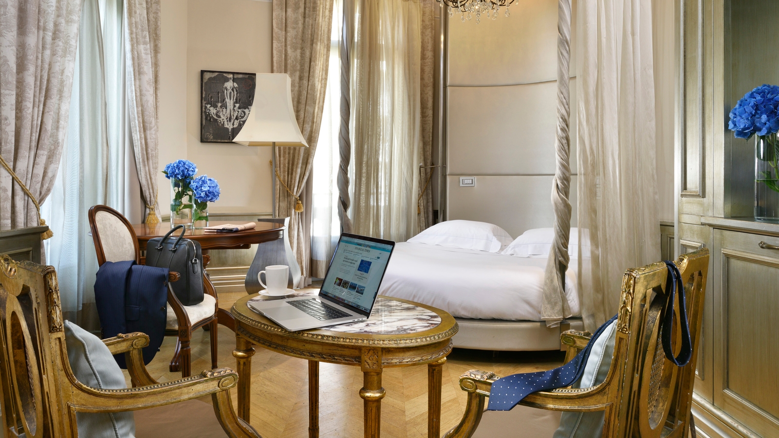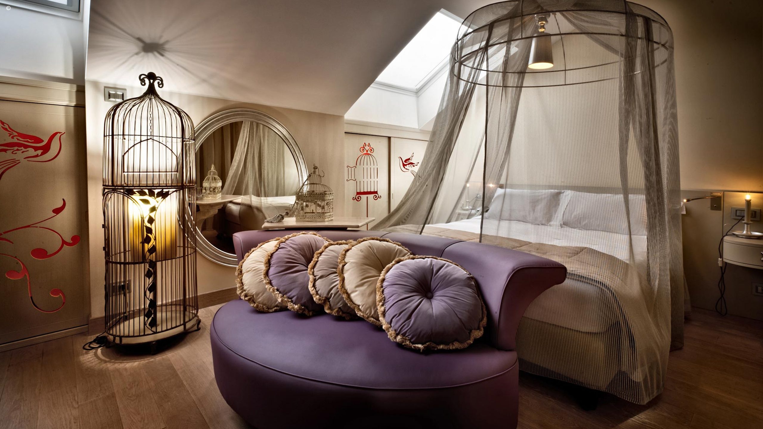Located in the heart of the city, the hotel is housed within an early 20th-century art nouveau building, and draws its inspiration from the world of fairytales and opera. Pastel colors adorn the walls of the 77 rooms, enhanced by floral patterns and butterflies, mosaics on the floors, mirrors and princely alcoves.