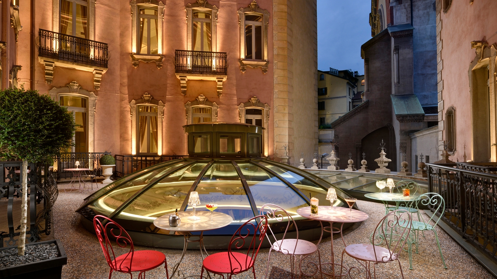 Downstairs you’ll find the exceptional glass-domed Lounge Bar Mezzanotte – the perfect spot to sip a Milanese aperitivo. The magnificent Rubacuori Restaurant is split into three unique rooms, including a room of mirrors and of ceramic animal head trophies, and specialises in modern Italian cuisine. Underneath it all is the Cella di Bacco, an inmate setting for an informal meal of cold cuts, cheese and fine wines.