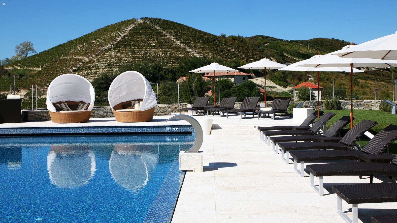 The outdoor swimming pool offers panoramic views of the Moscati vineyards and the Langa Hills, but for the ultimate in relaxation you’ll want to head to the spa. A real highlight, it has a wine hammam with a Jacuzzi filled with water and wine, and a sauna in the shape of a barrel.