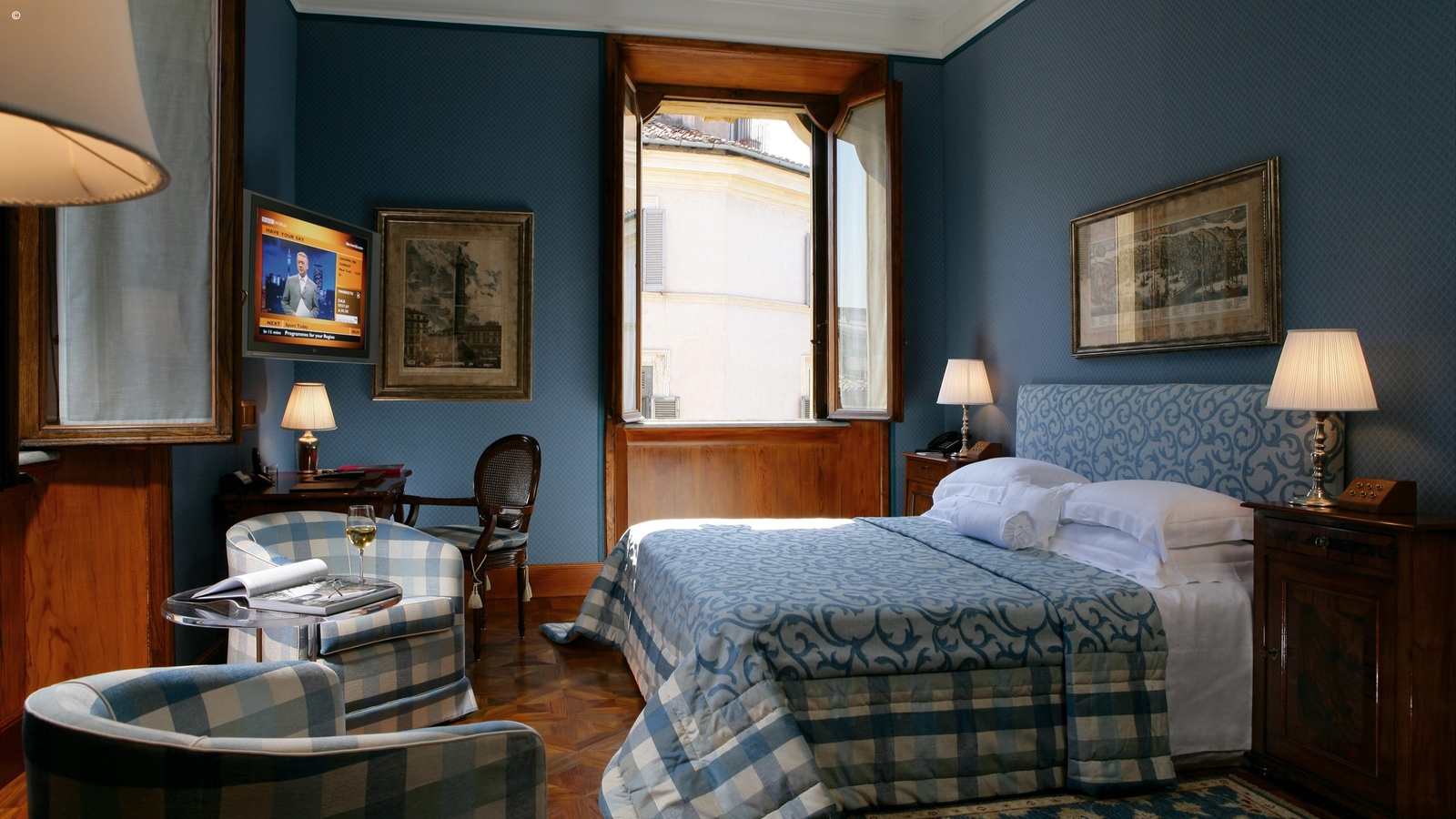 Communal areas are full of antiques and art, the library is listed and lounge areas steeped in a dark wood, old world luxury. Outside are peaceful formal gardens that form a walled oasis away from the Rome’s bustle.