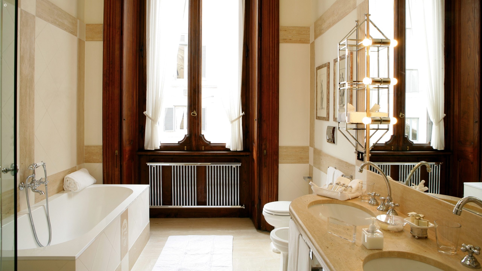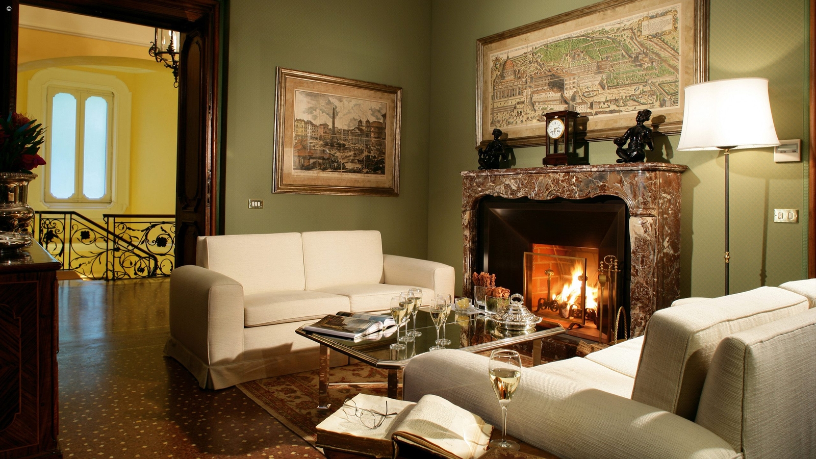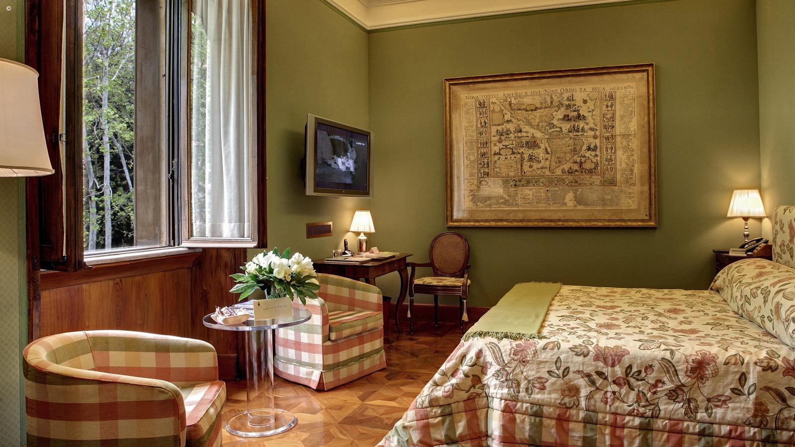 Overlooking the greenery are just 12 rooms, warm and welcoming, with subtle modern touches enhancing the historic charm of the original features. Large beds are clad in Fiandra linen sheets and alpaca or cashmere throws. Bathrooms are spacious and lined in marble, and all have baths as well as showers. Well-stocked minibars are complimentary.