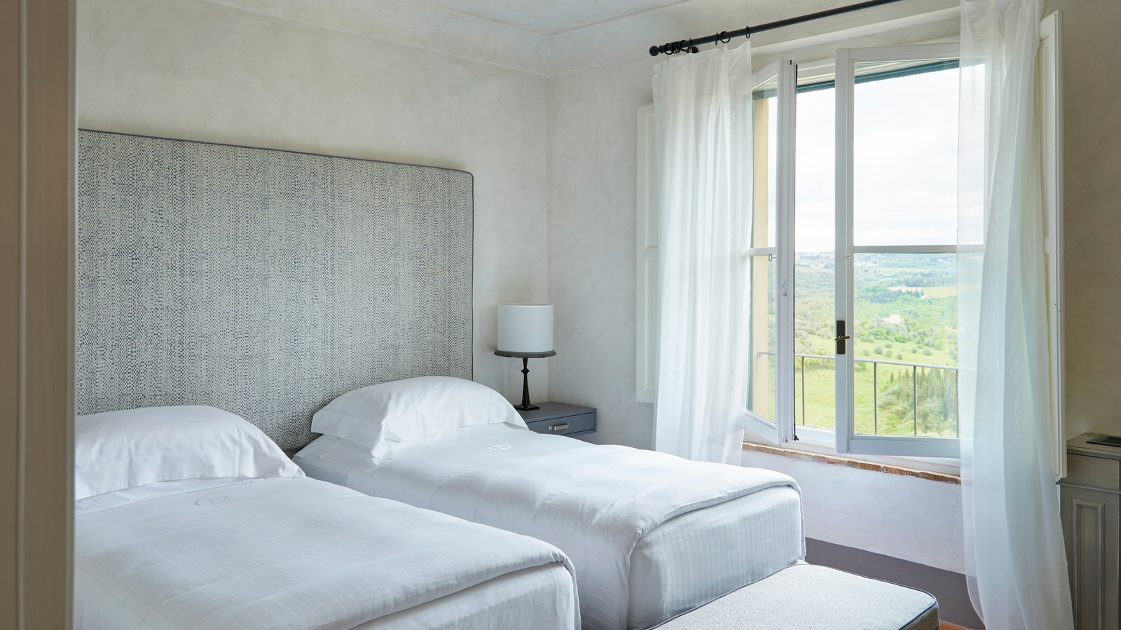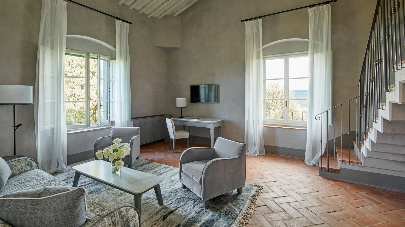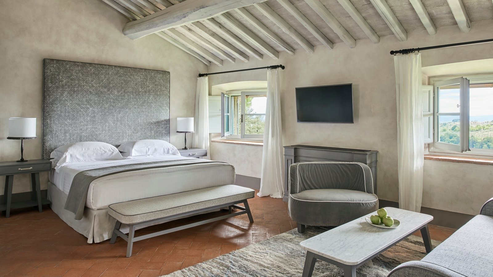 Each of the 50 rooms and suites look out over quintessentially rolling Tuscan countryside and the estate’s olive groves and vineyards that are frequented by pheasant, deer and wild boar.