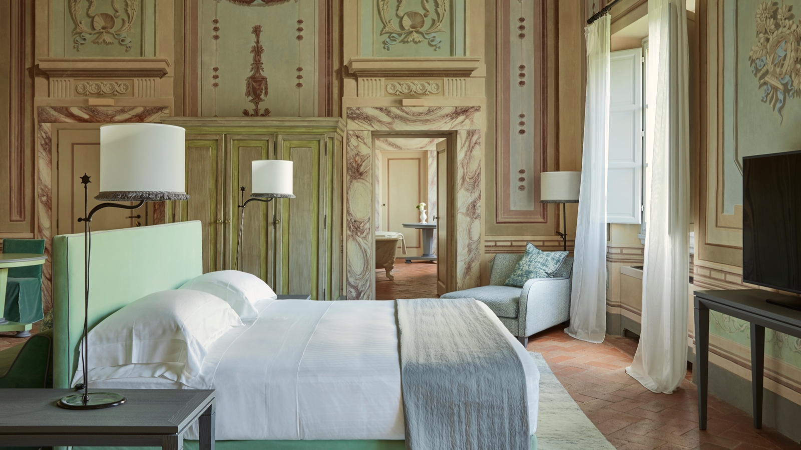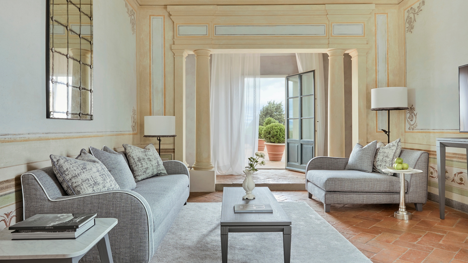 Suites, some of which feature their own terraces, have each had interiors restored to recreate the original decor, which include hand painted ceilings and family crests. All the rooms rooms maintain their historic authenticity yet provide all modern comforts.