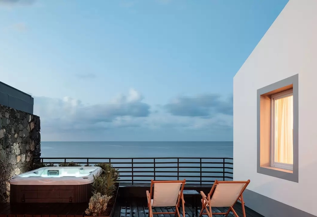 The hotel’s architecture is a tasteful synthesis of modern architectural features with regional workmanship. The calm ambiance is accentuated by its predominately white color scheme, which also lets the colorful surroundings take center stage. The expansive windows and private patios ensure that guests are always in touch with the enchanting natural beauty of the Azores. These views include the Atlantic Ocean, beautiful gardens, and the adjacent islands.