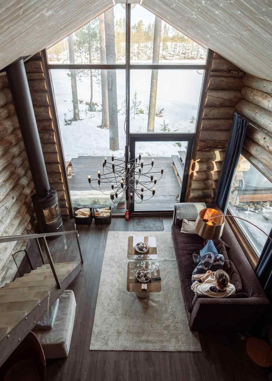 There are three log cabins, one of which is a family cabin sleeping up to four people. Each features a bathroom, fireplace and private outdoor Jacuzzi. Large panoramic windows allow you to enjoy your surroundings – the pale haze of an early morning and the sprinkling of stars on a clear night is truly magical. There is also a wood-fired sauna in a separate building.