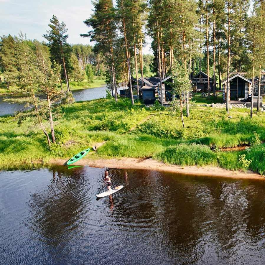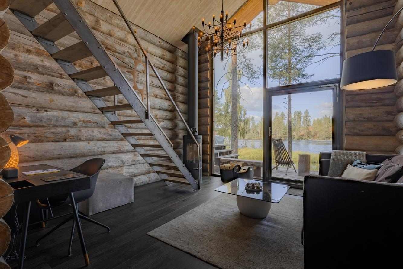 There are three log cabins, one of which is a family cabin sleeping up to four people. Each features a bathroom, fireplace and private outdoor Jacuzzi. Large panoramic windows allow you to enjoy your surroundings – the pale haze of an early morning and the sprinkling of stars on a clear night is truly magical. There is also a wood-fired sauna in a separate building.