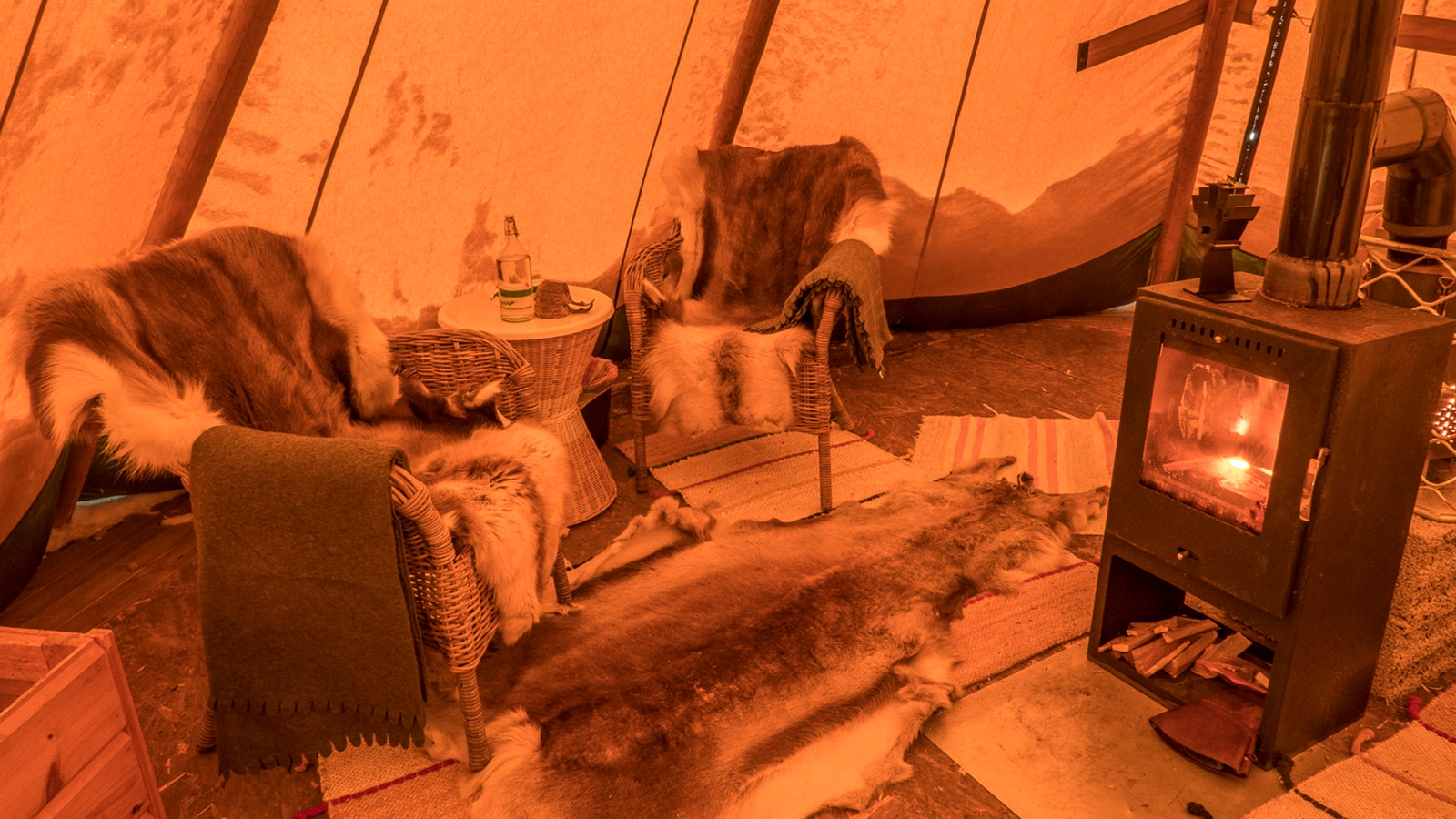 The camp consists of up to five traditional lavvu tents comfortably furnished with double beds, wood-fired stoves and simple Sami furniture, each stood on a wooden platform, spread out around a small cabin close to a central cabin with a dining room and warm outhouse.